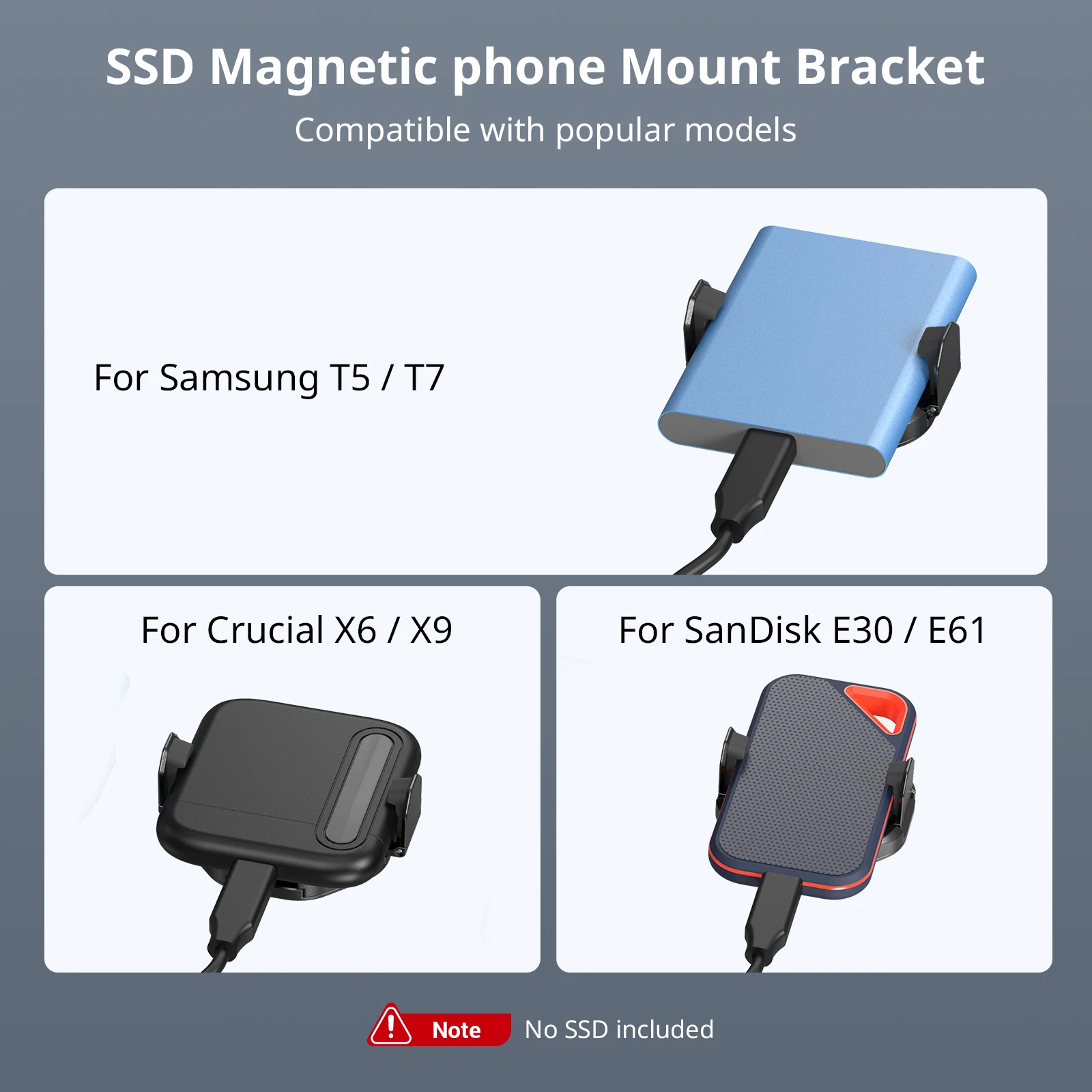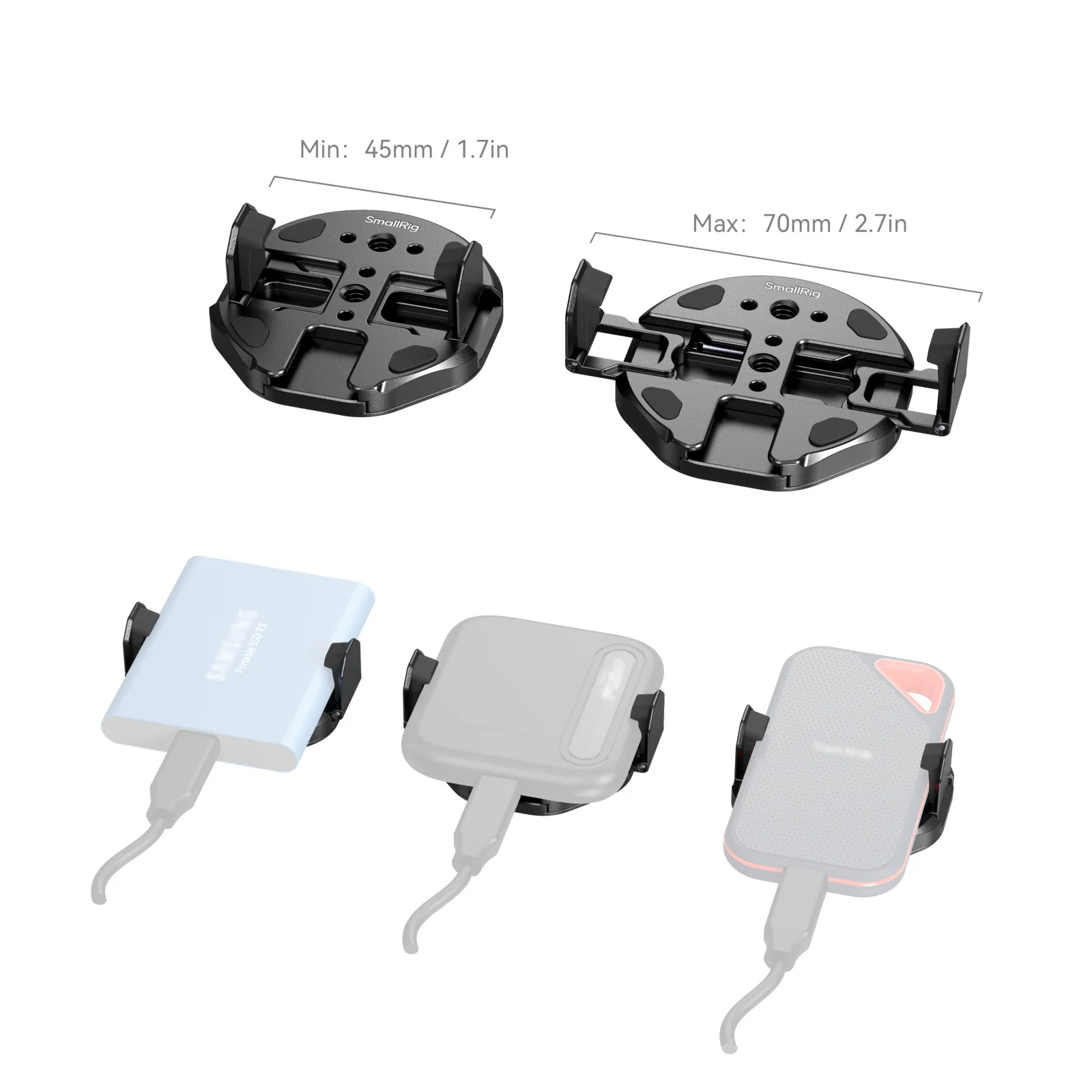 1.45 - 70mm(1.7 - 2.7in)의 매우 넓은 클램핑 범위, 삼성기기 호환 호환 호환, SanDisk, Crucial 등의 SSD와 호환 가능