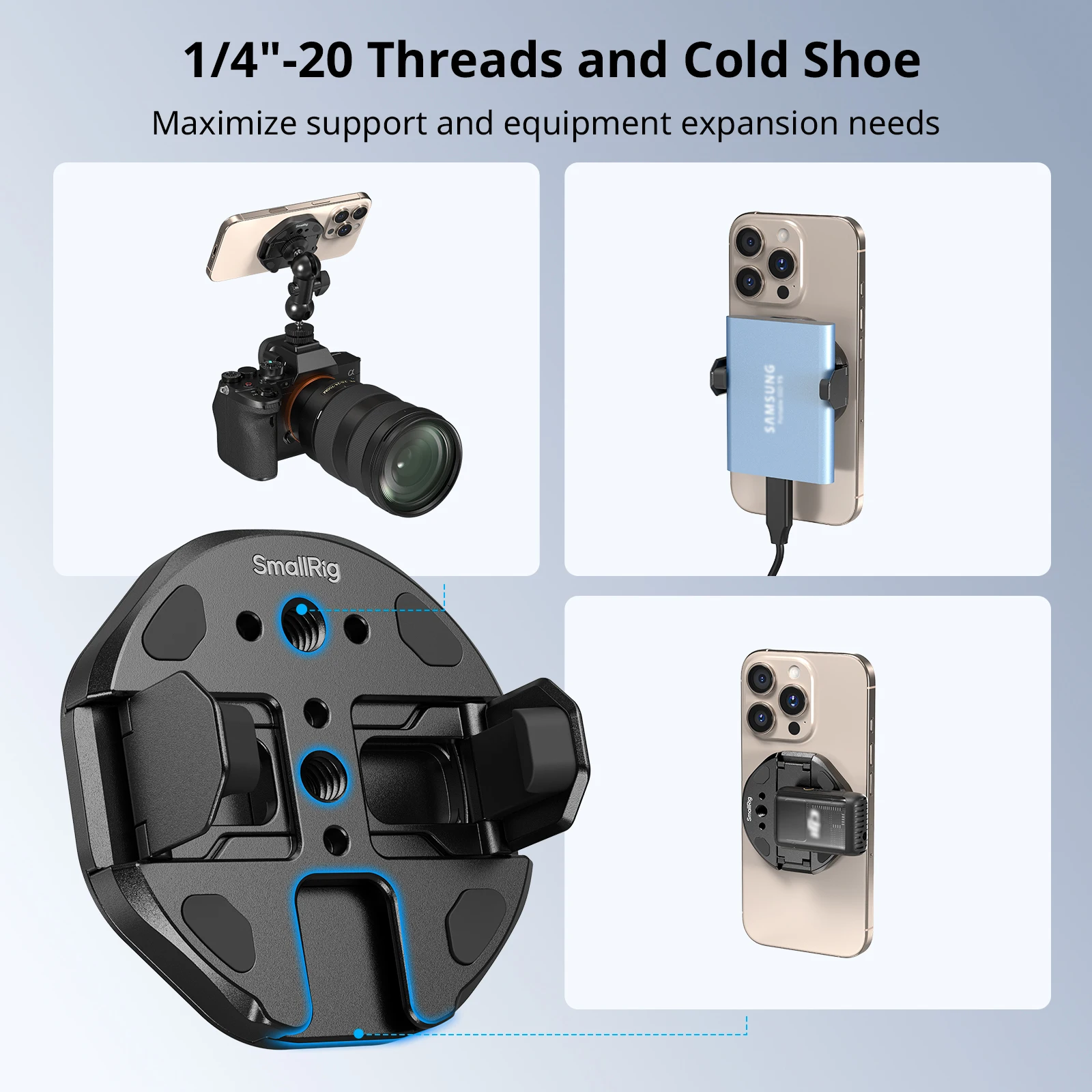 SSD 홀더에는 2개의 1/4"-20 위치 지정 구멍과 매직 암(ID 3874, 3826), 셀카봉 및 DJI 호환 호환 무선 마이크 2와 같은 액세서리를 부착하기 위한 콜드 슈 마운트 1개가 있어 안정적인 지지력과 다양한 확장 옵션을 제공합니다.MagSafe 지원 iPhone과 호환되므로 스마트폰에서 쉽게 부착하고 분리할 수 있습니다.