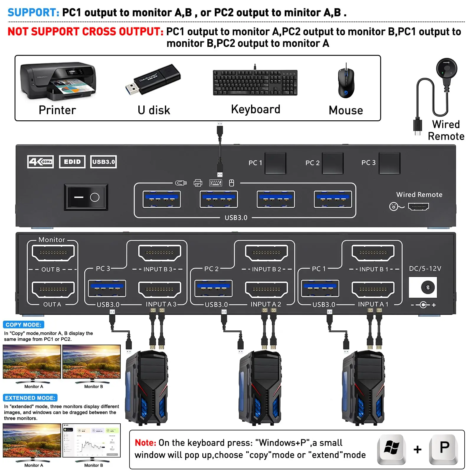 1. 【듀얼 모니터 KVM 스위치 3 In 2 Out】 이 듀얼 모니터 KVM HDMI 스위치는 키보드 및 마우스 1 세트와 2 개의 모니터로 3 대의 컴퓨터/latops를 제어 할 수 있습니다 (디스플레이 모드 확장 또는 디스플레이 모드 복사)?참고: "Window + P" 를 누르면 "중복" 모드 또는 "확장" 모드를 선택할 수있는 작은 창이 나타납니다.