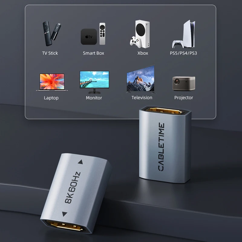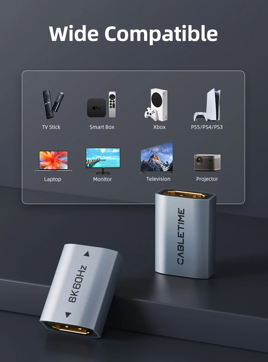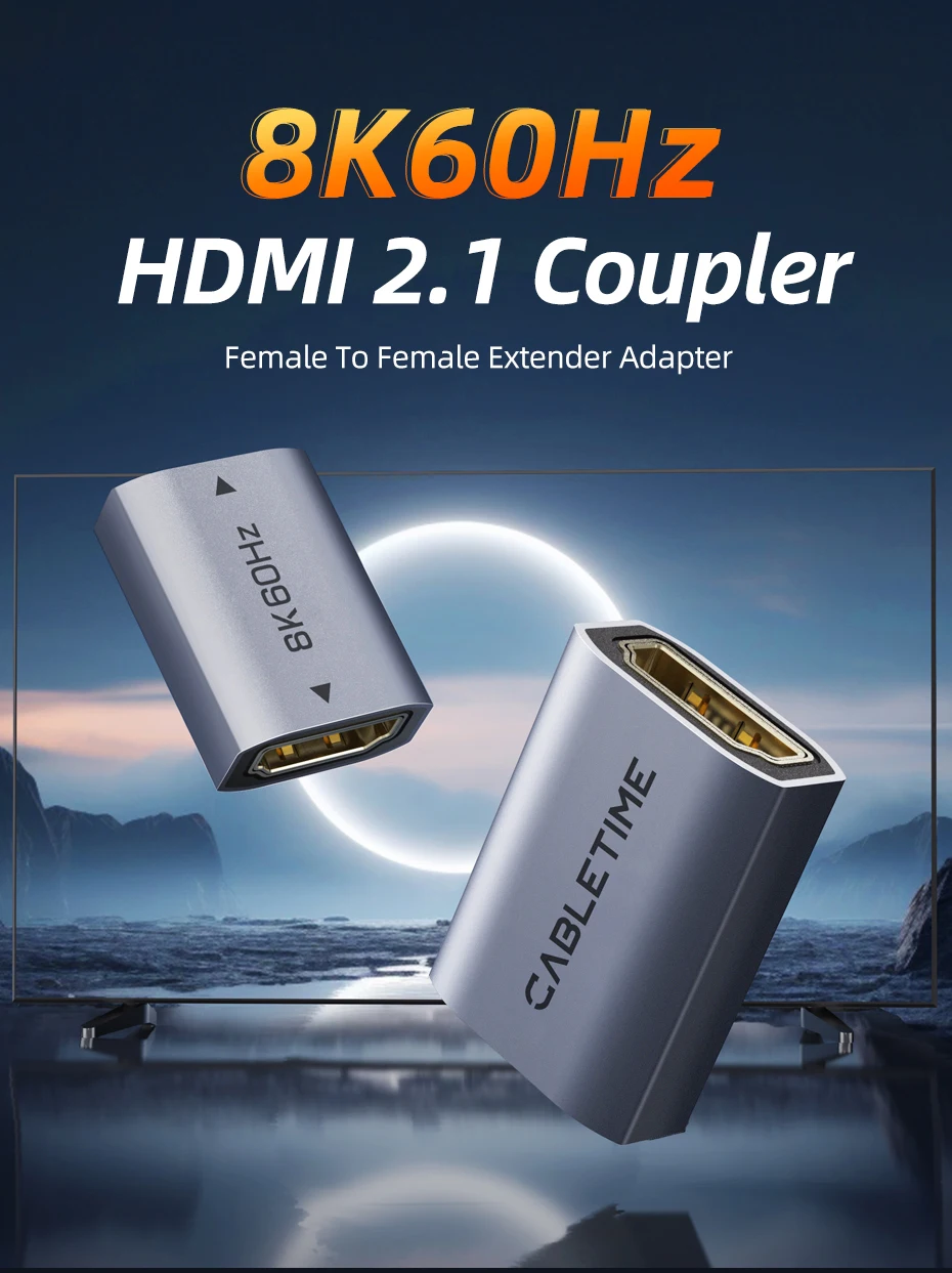 Cabletime HDMI 연장기 암암 커플러 어댑터는 최신 HDMI 2.1 표준을 충족하여 48Gbps의 뛰어난 성능을 제공합니다.이 인상적인 전송 속도는 안정적인 신호 흐름을 보장하여 프레임이 막히거나 떨어질 염려를 없애줍니다.진정으로 유동적이고 즐거운 시각적 경험을 위해 중단 없이 중단 없이 시청하세요.