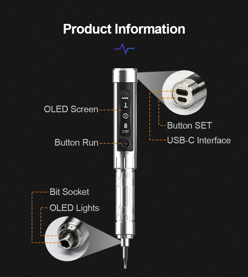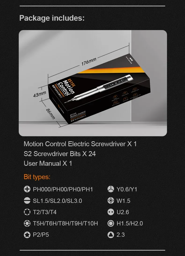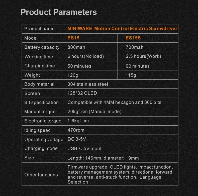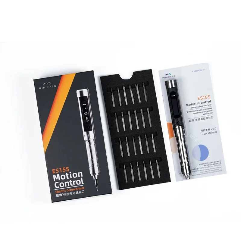 MINIWARE ES15S 모션 원격제어 전기 스크루 드라이버 USB 충전식 무선 4mm 16pcs LED 세트 비트 라이트