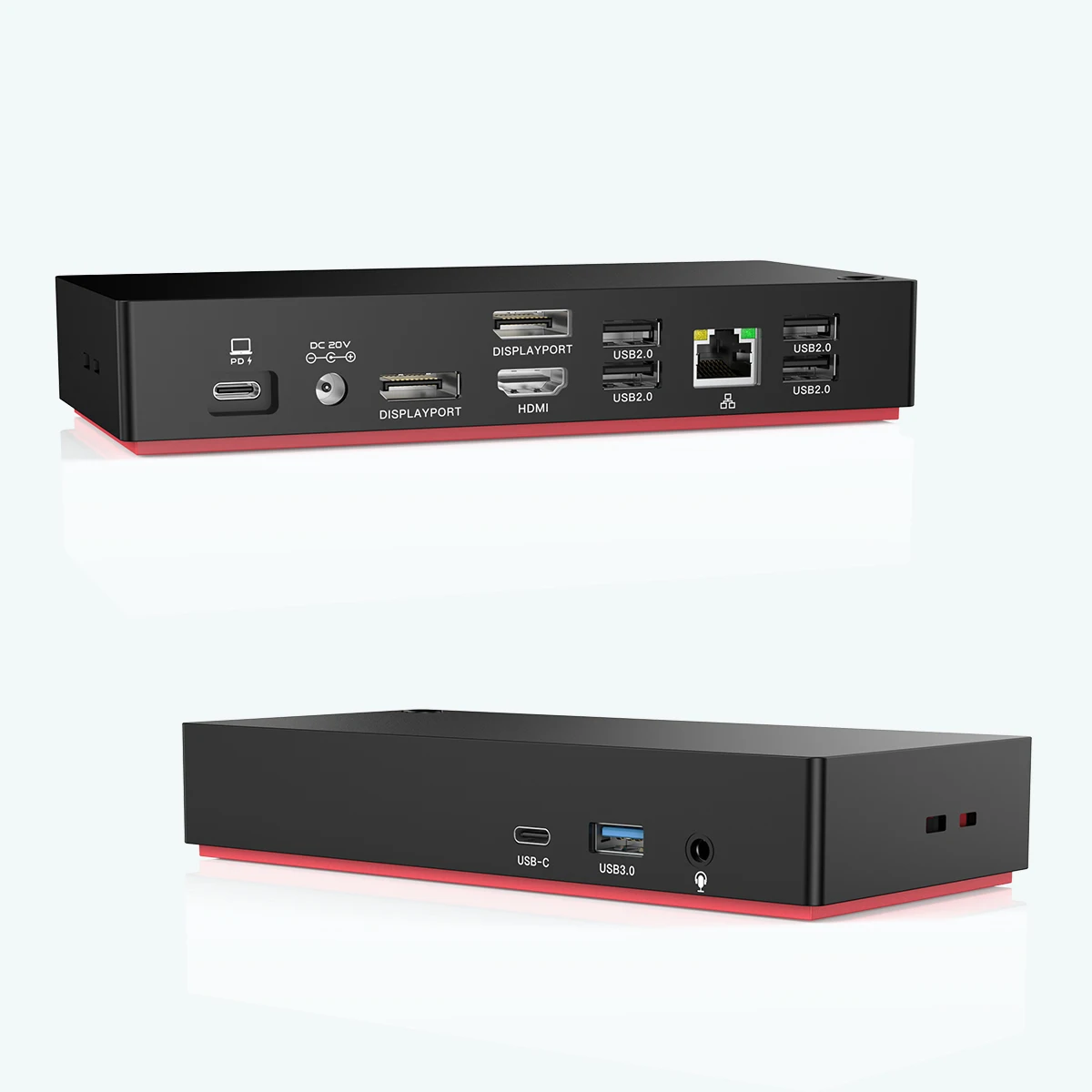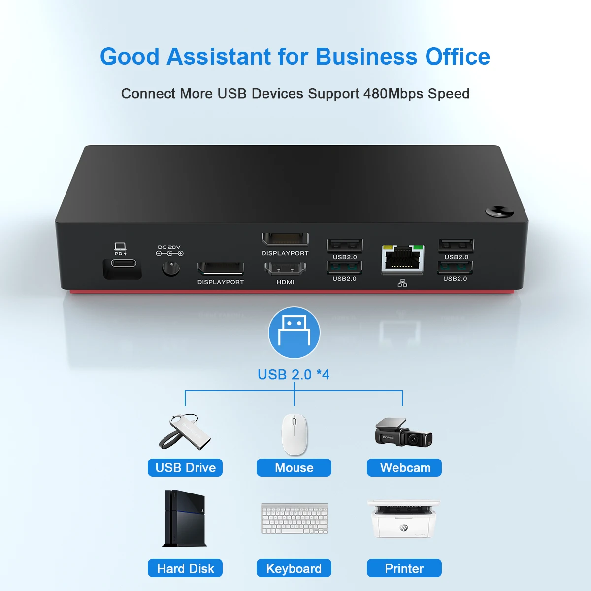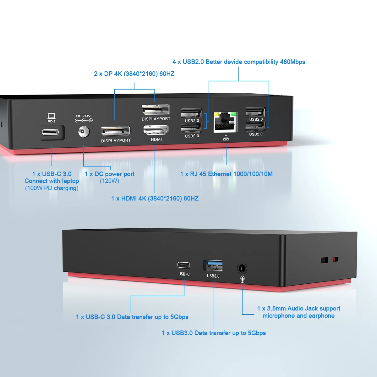 1 X USBC 3.0 노트북과 연결하고 100W PD 충전 지원 DP 4K(3840*2160) 60HZ 2개 1x4K(3840*2160) 60HZ 4 X USB2.0 더 나은 장치 호환성 480Mbps 1개의 RJ 45 이더넷 1000/100/10M 1 X USBC 3.0 최대 5Gbps 데이터 전송 1 X USB3.0 최대 5Gbps 데이터 전송 1 X 3.5mm 오디오 잭 지원 마이크 및 이어폰 1 X DC POWER LOGIC 포트 100W 어댑터 포함 |