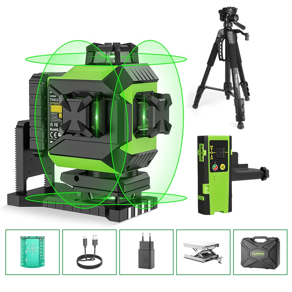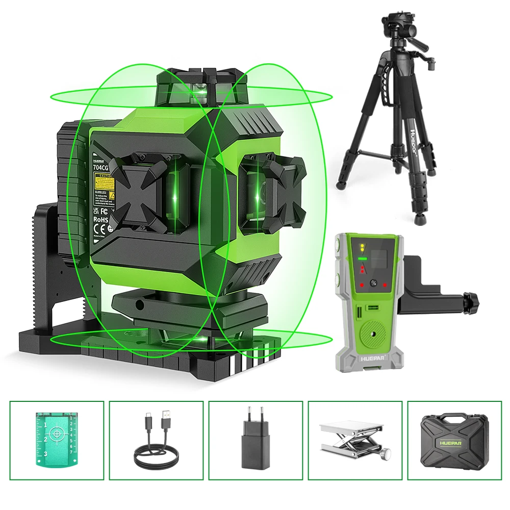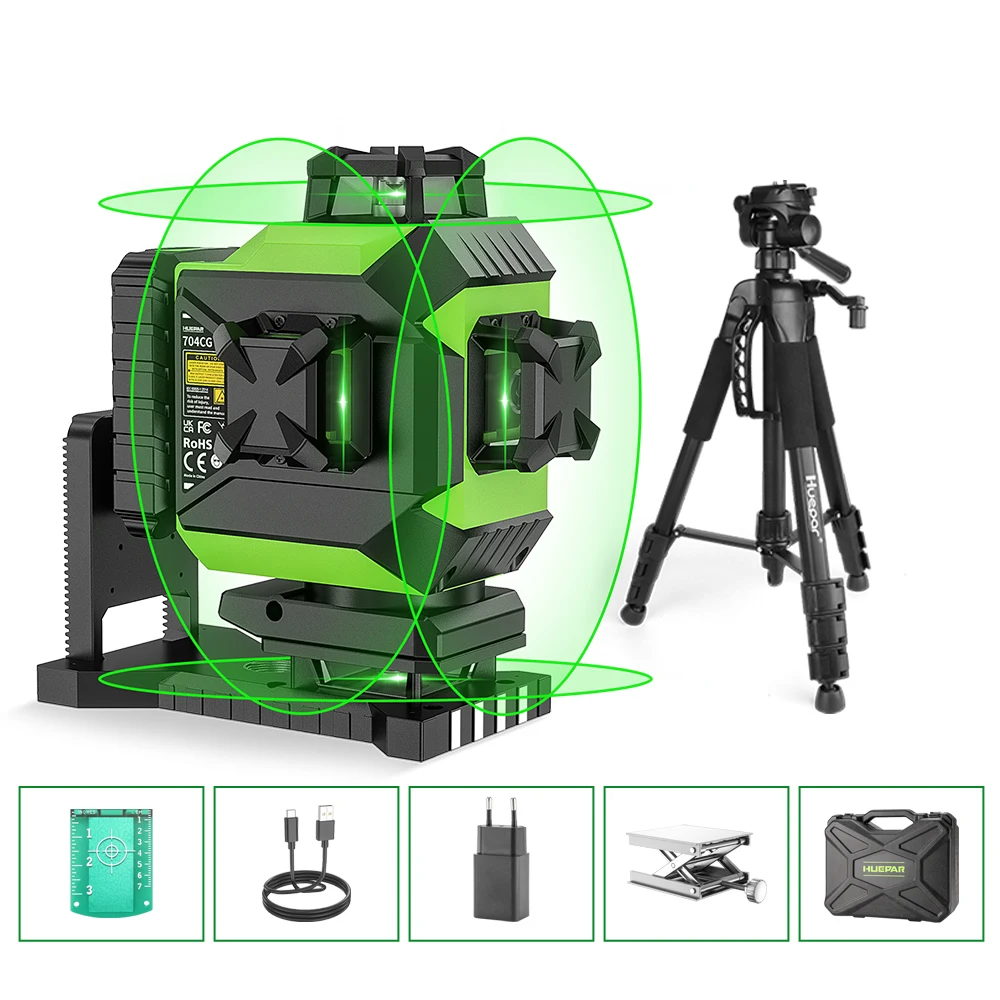Huepar Osram 레이저 레벨 셀프 레벨링 4D 그린 빔 360 ° 크로스 라인 16 라인 타일 바닥 레이저 도구 대형 리튬 이온 배터리 704CG