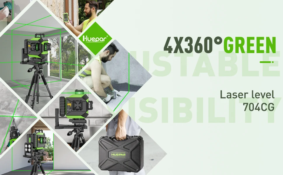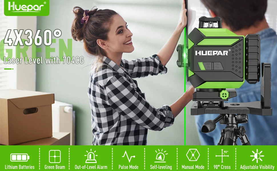 Huepar 704CG 바닥 레이저 도구는 타일, 석재, 벽돌, 카펫 및 경목 바닥의 배치에 대한 모든 평준화 적용 범위를 제공하는 바닥이나 벽에 360 ° 수평 타일 레이저 하나를 생성합니다.
