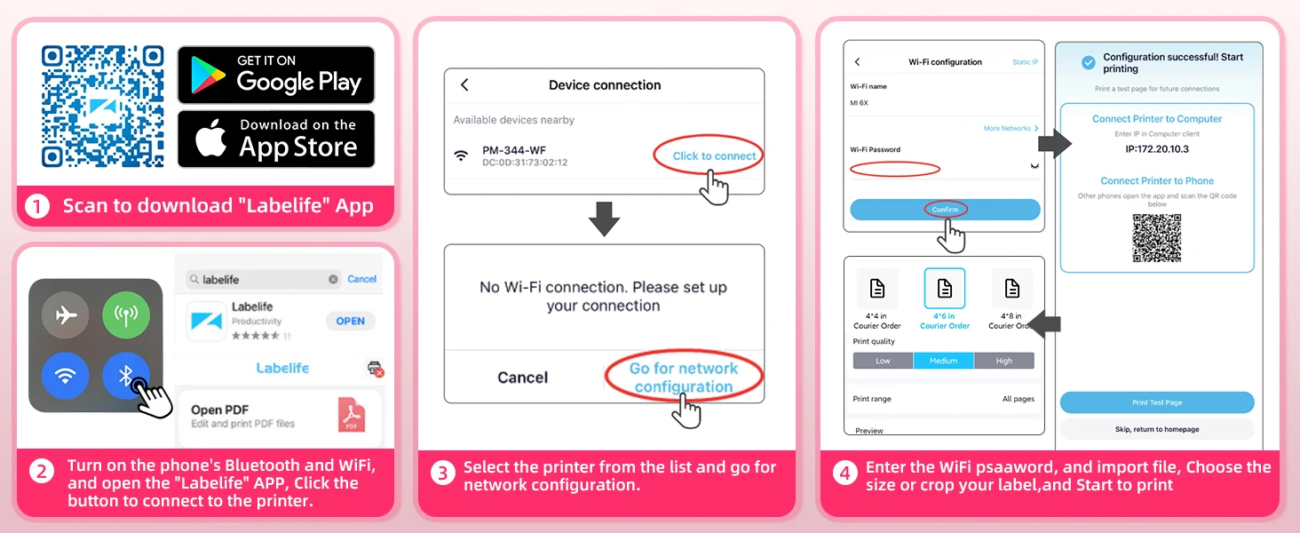 [쉬운 설정 및 사용]-열 배송 라벨 프린터는 간단한 제어를 위해 2 개의 키가있는 사용자 친화적 인 디자인으로 누구나 쉽게 사용할 수 있습니다. 또한, 다른 장치에는 구성 방법이 다릅니다. ①휴대 전화 및 태블릿의 경우 열 라벨 프린터 4x6 과 일치하도록 APP "Labelife" 를 직접 설치하고 2 분 안에 인쇄를 시작할 수 있습니다. ②PC의 경우 네트워크 설정 도구 (설명서에서 쉽게 찾을 수 있음) 를 다운로드하고 간단한 설정으로 2 분 이내에 인쇄를 시작하십시오. 참고: WiFi 라벨 프린터는 Bluetooth를 통해 검색 할 수 있지만 4x6 라벨 프린터는 Bluetooth 인쇄를 지원하지 않습니다.