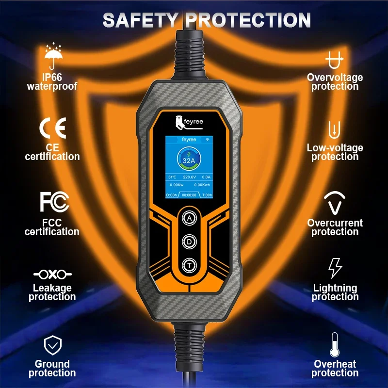 【안전하고 신뢰할 수 있음】전기 자동차 충전 시 안전은 최우선 사항입니다.당사의 EV 충전기는 낙뢰 방지, 누전 방지(TypeB AC30mA+DC6mA), 과전압, 과열 방지, 과전류 방지, 접지 보호 등 다양한 보호 시스템으로 설계되었습니다.케이블은 고급스럽고 견고한 TPU 소재로 제작되었으며, 커넥터는 IP66 방수 및 방진 보호 기능을 갖추고 있어 이 가정용 EV 충전기를 더욱 안전하고 안정적으로 만들어줍니다.
