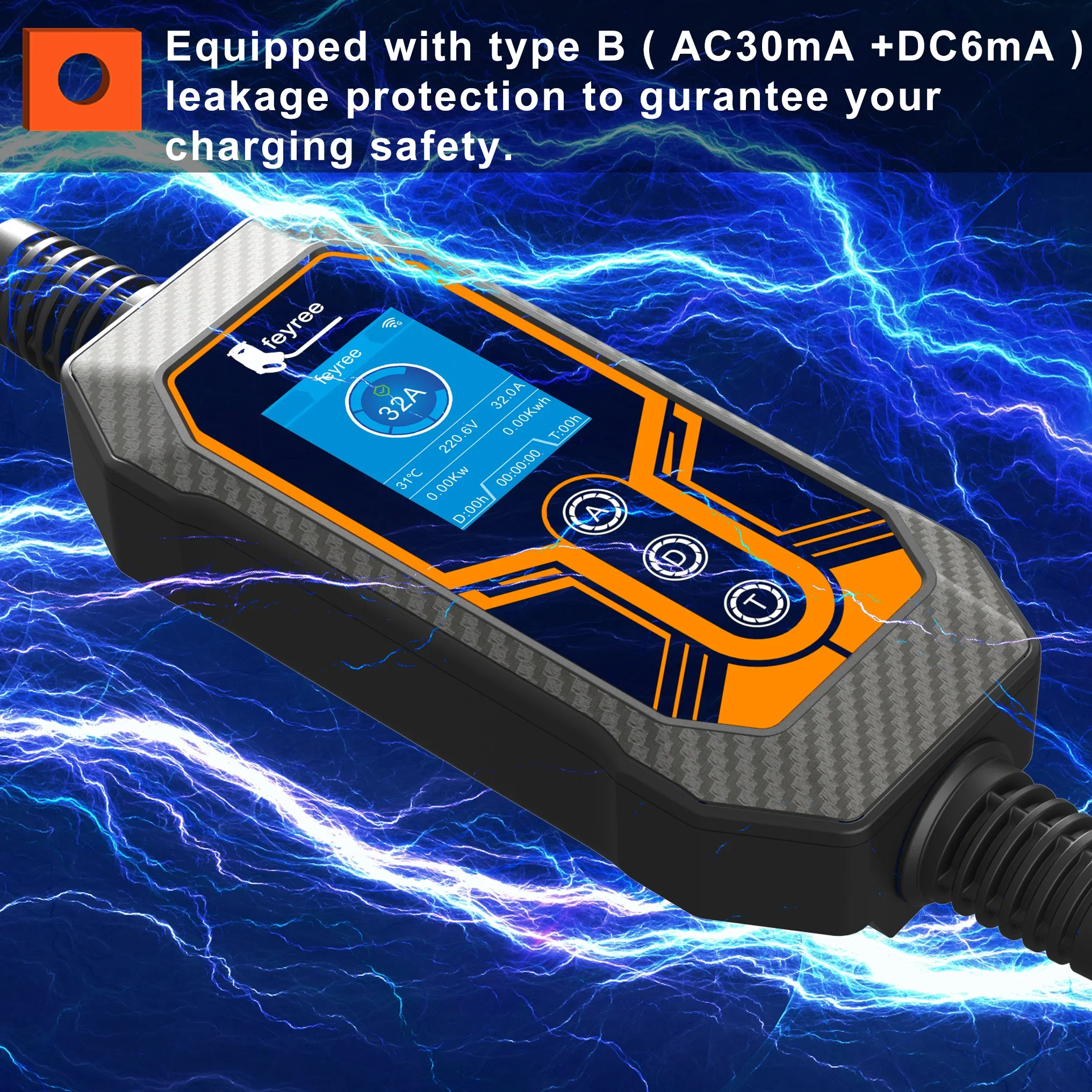 【더 빠른 충전】이 EV 충전기는 240V 전압과 8A/10A/13A/16A/20A/25A/32Amp의 조정 가능한 전류를 기반으로 하며 최대 출력 전력은 최대 7KW에 이릅니다. EV 차량 충전 속도를 더욱 빠르게! (참고: 전기 자동차의 실제 충전 시간은 전원과 차량의 온보드 충전기 용량의 두 가지에 따라 달라집니다.)
