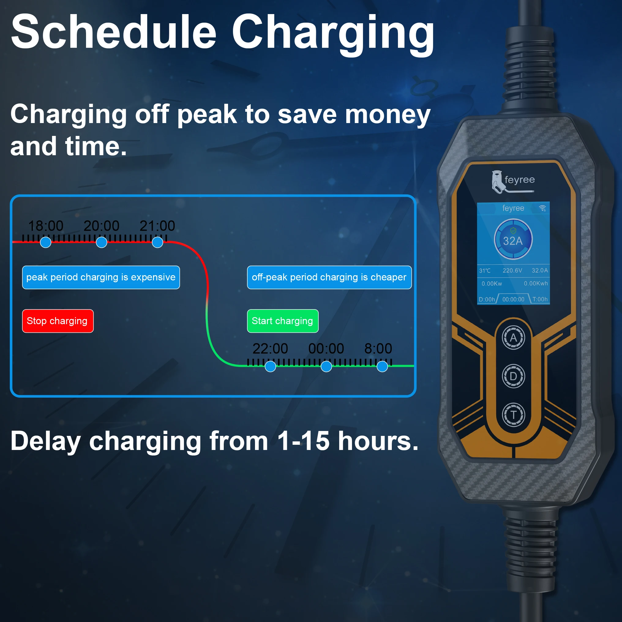 【원하는 충전 시간 예약】: 지연 버튼을 눌러 원하는 시간에 충전을 시작하도록 충전기를 설정할 수 있습니다.밤새 충전에 적합하며 피크 시간보다 낮 시간에 충전하는 경우 비용이 적게 듭니다.잠자리에 들기 전 "지연" 버튼을 누르면 다음날 아침 완전 충전된 차로 하루를 시작할 수 있습니다.충전이 끝나면 문제 없이 플러그를 꽂아 둘 수 있습니다.충전기가 완전히 충전되면 자동으로 전원이 꺼집니다.
