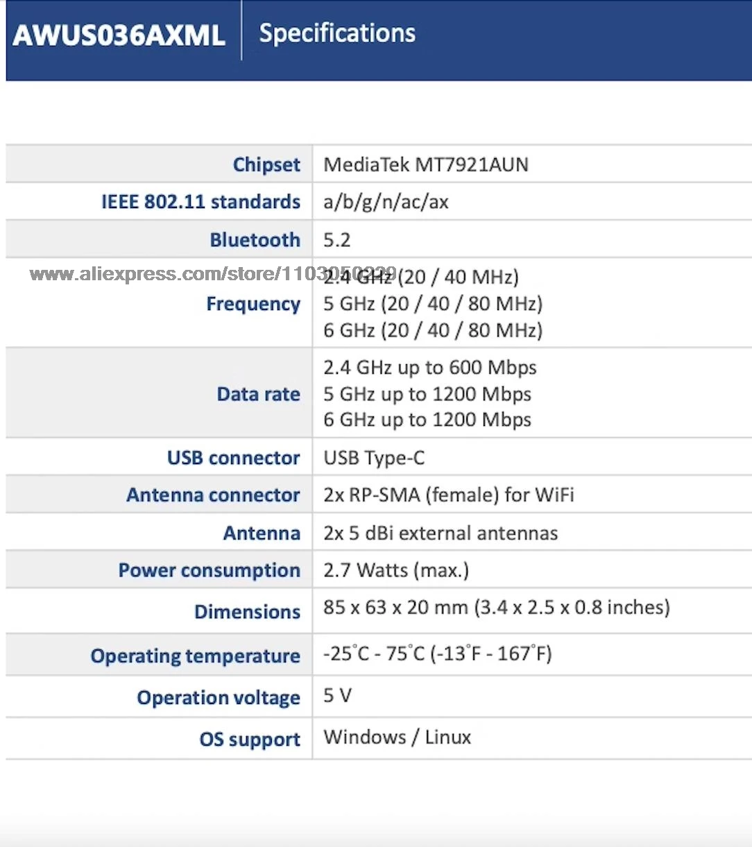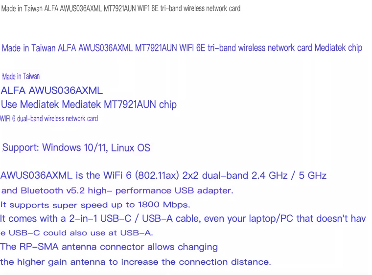 대만산 ALFA AWUS036AXML MT7921AUN WIFI 6E 트라이밴드 무선 카드 네트워크
