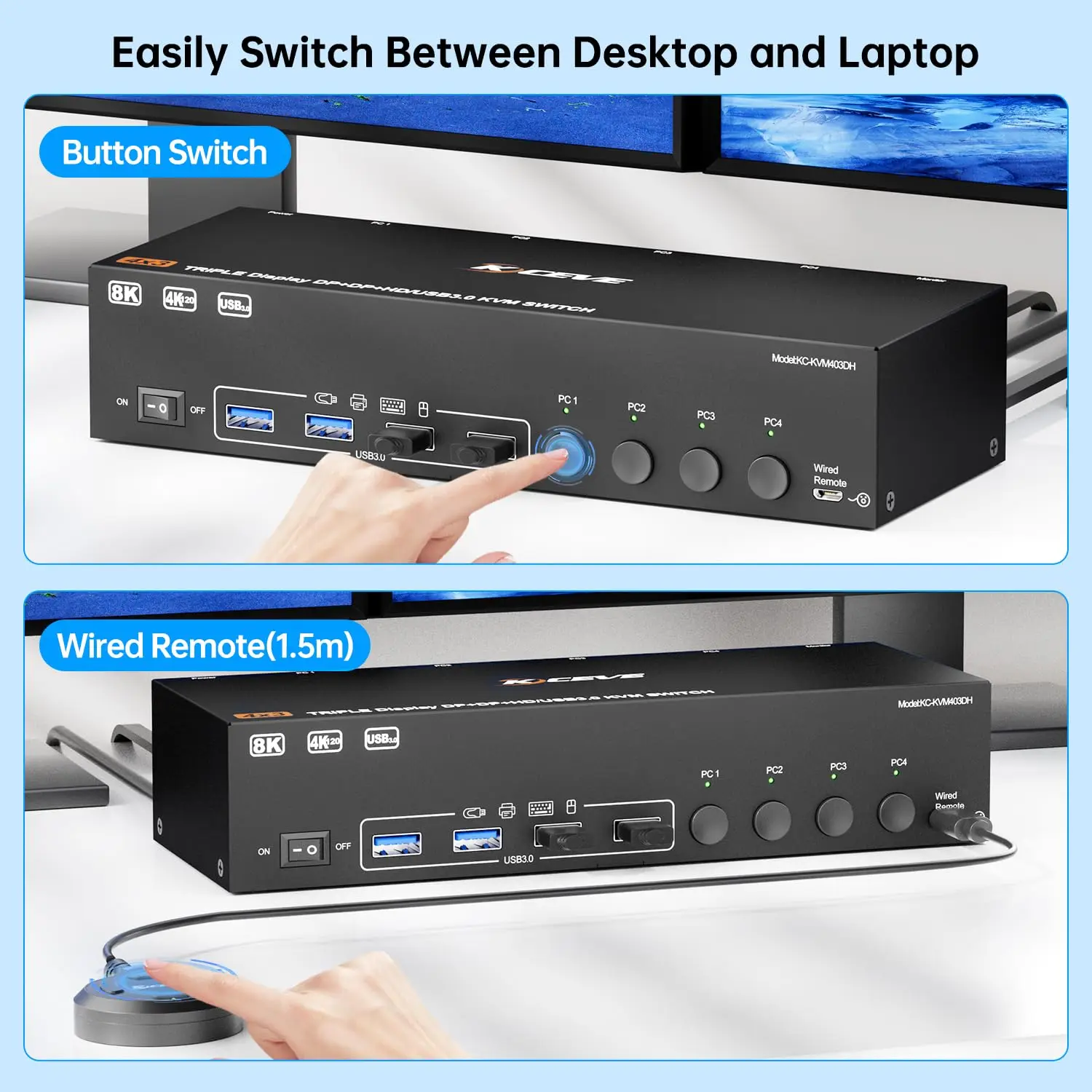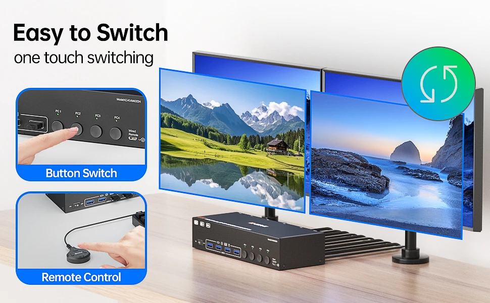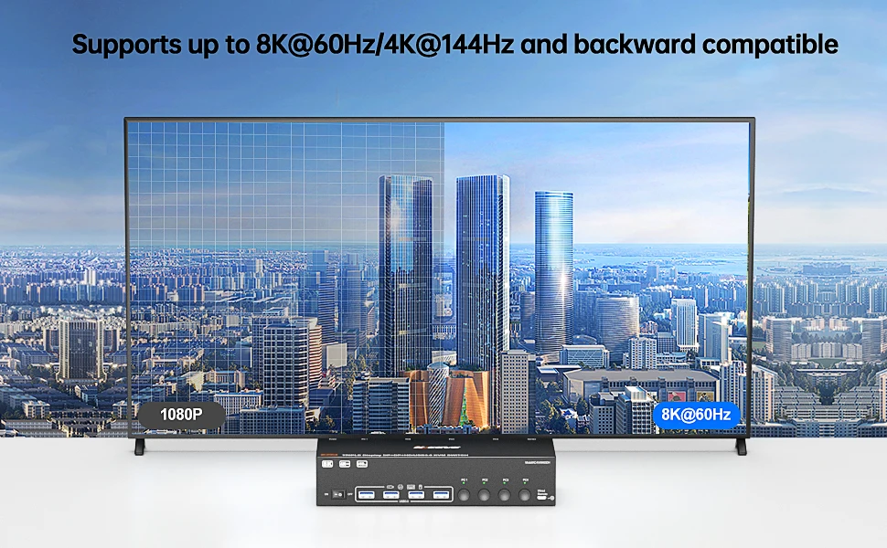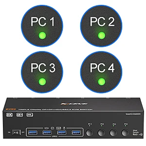 KVM 스위치는 4대의 컴퓨터와 3대의 모니터를 지원하며, 최대 3840*2160@60Hz/4K@144Hz 해상도를 지원하고 하위 호환이 가능합니다.