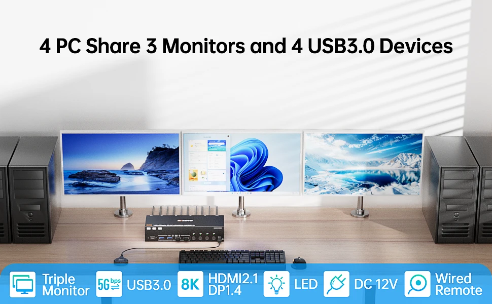 업그레이드된 12V POWER LOGIC 어댑터는 8K 트리플 모니터 KVM 스위치가 보다 원활하게 작동하도록 보장하고 고전력 USB 주변 장치를 연결할 때 보다 안정적인 장치 인식을 제공합니다.