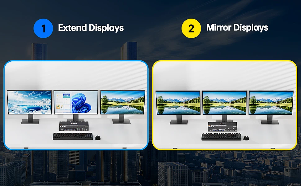 4대의 컴퓨터를 위한 이 3모니터 KVM 스위치는 다중 화면 디스플레이를 지원하며 필요에 따라 3개 모니터에 대해 미러 모드 또는 확장 모드 중에서 선택할 수 있습니다.미러 모드에서는 세 화면 모두 동일한 콘텐츠를 표시하고, 확장 모드에서는 각 화면에 서로 다른 콘텐츠를 표시할 수 있습니다.