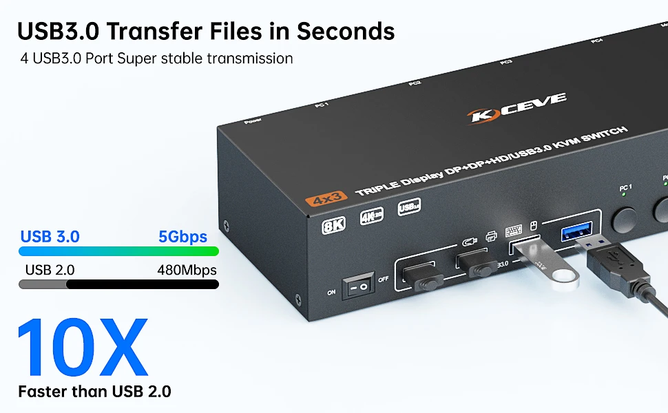 이 트리플 모니터 KVM 스위치는 USB 2.0보다 10배 빠른 최대 5Gb/s의 초고속 USB 3.0 데이터 전송 속도를 지원합니다.