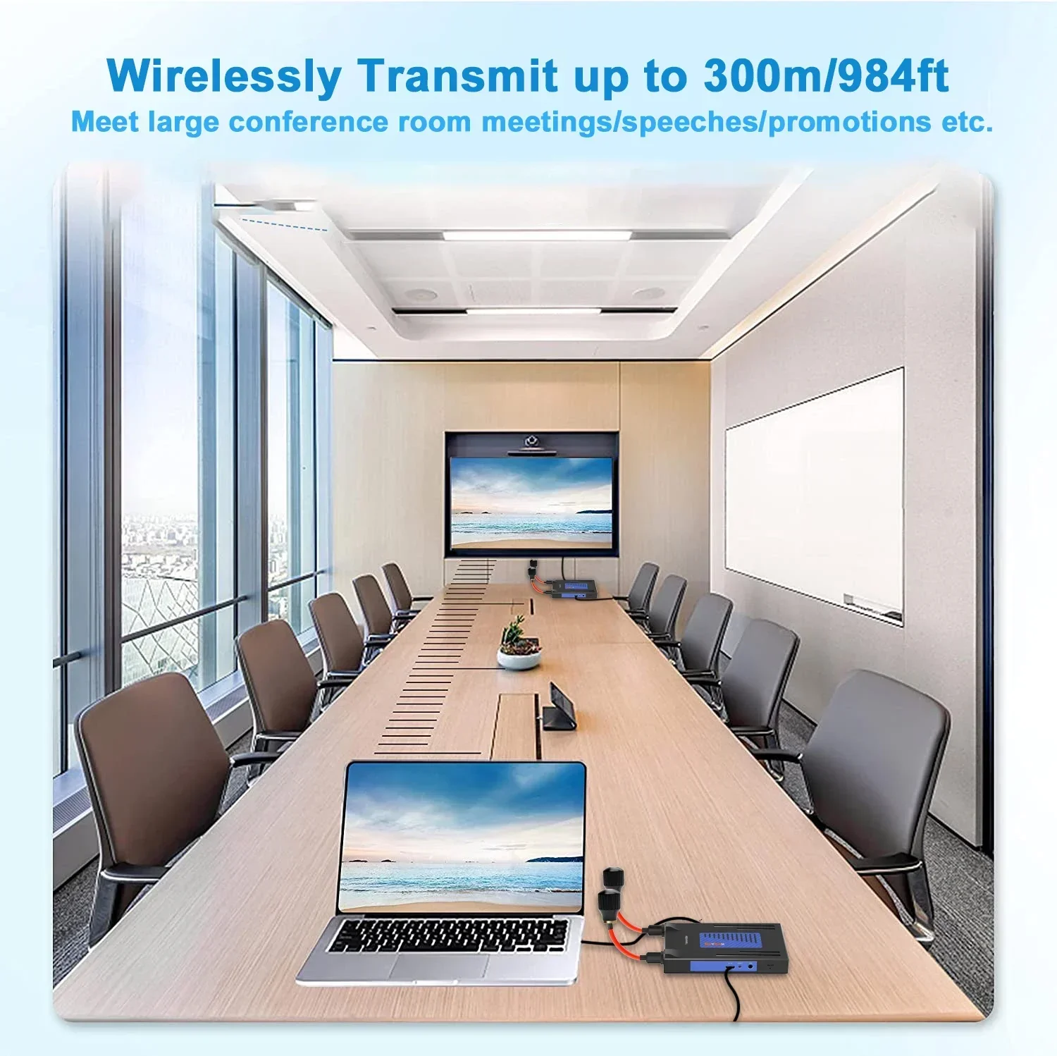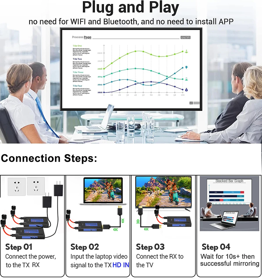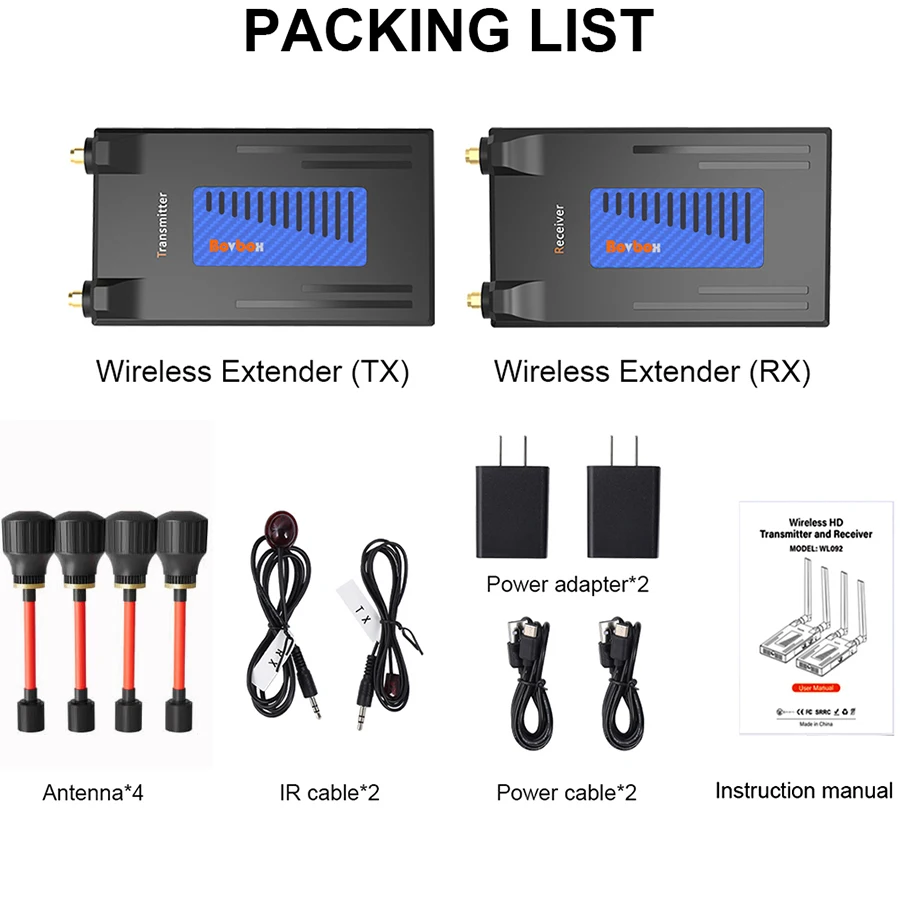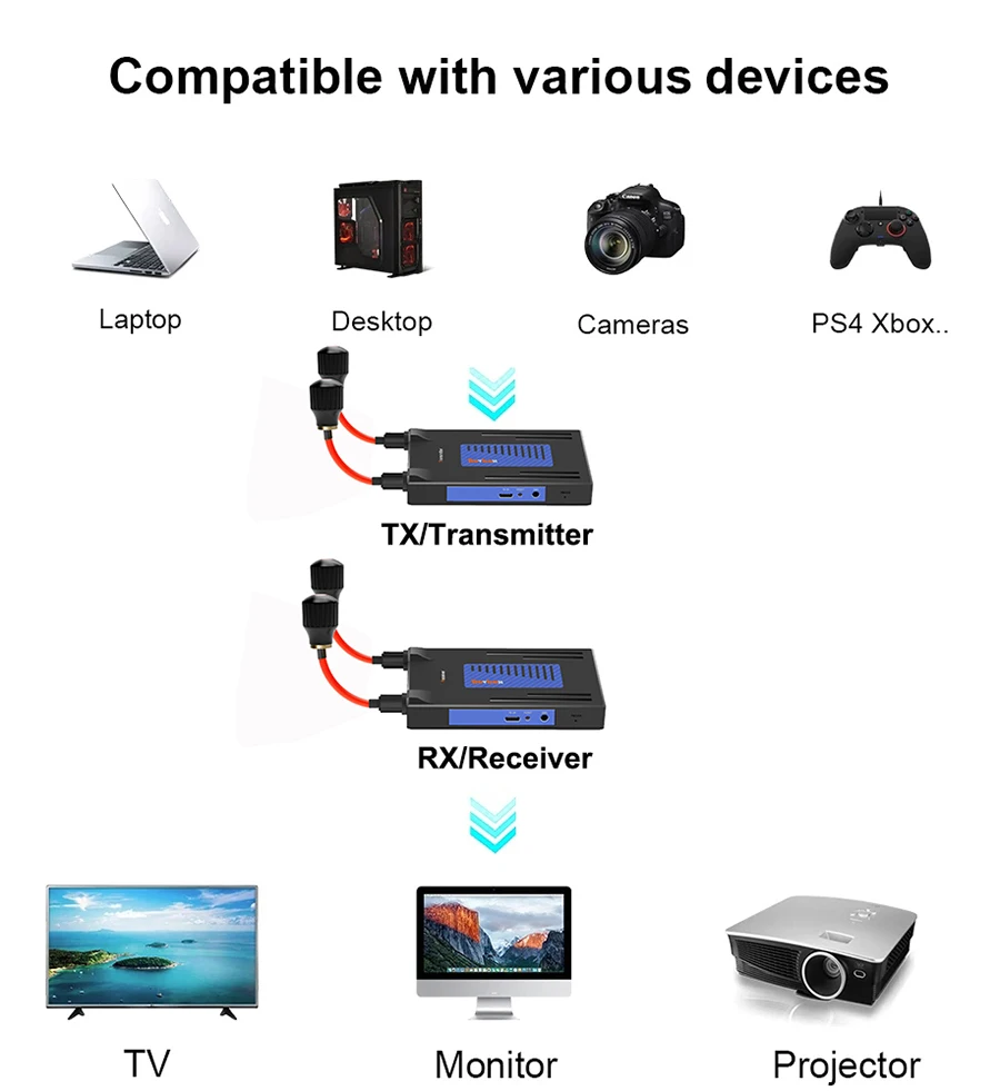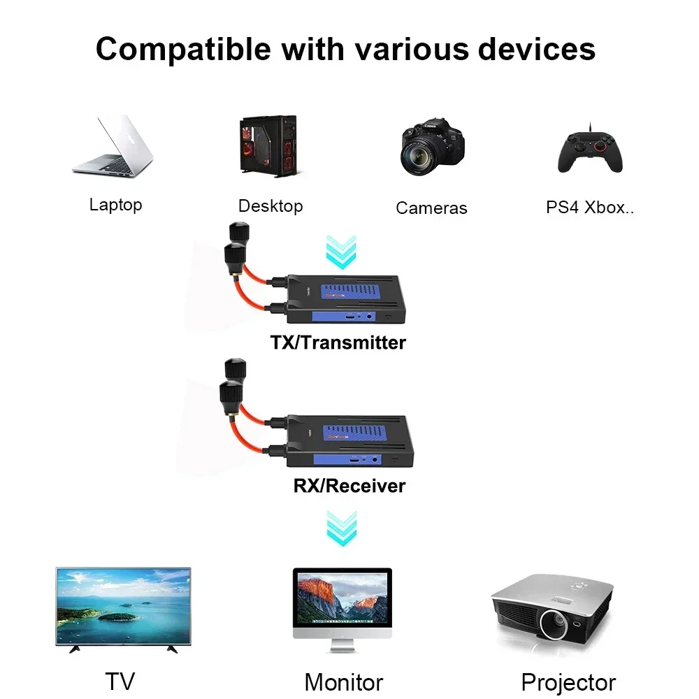 이 무선 확장기는 내장된 무선 전송 프로토콜을 통해 HDMI 오디오 비디오 신호를 전송합니다.