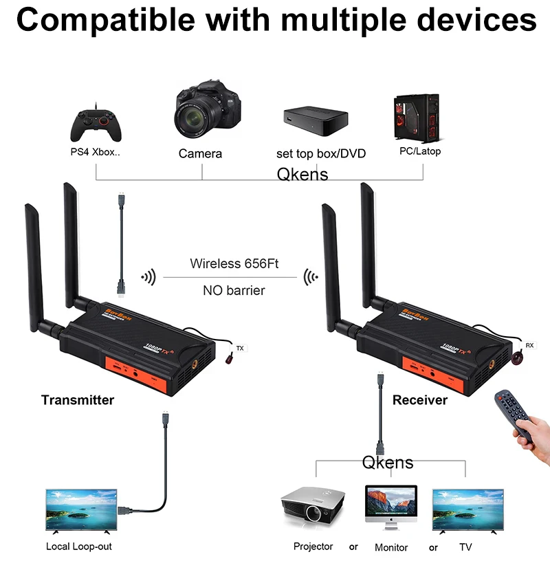 TX는 DVD, DVR, TV 셋톱 박스, HD 카메라, 노트북, PS 3/4/5 등 비디오 소스 장치에 연결됩니다.