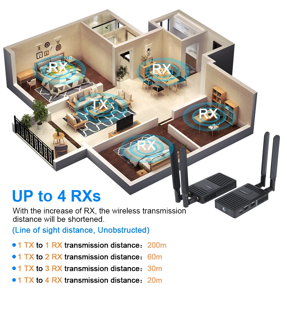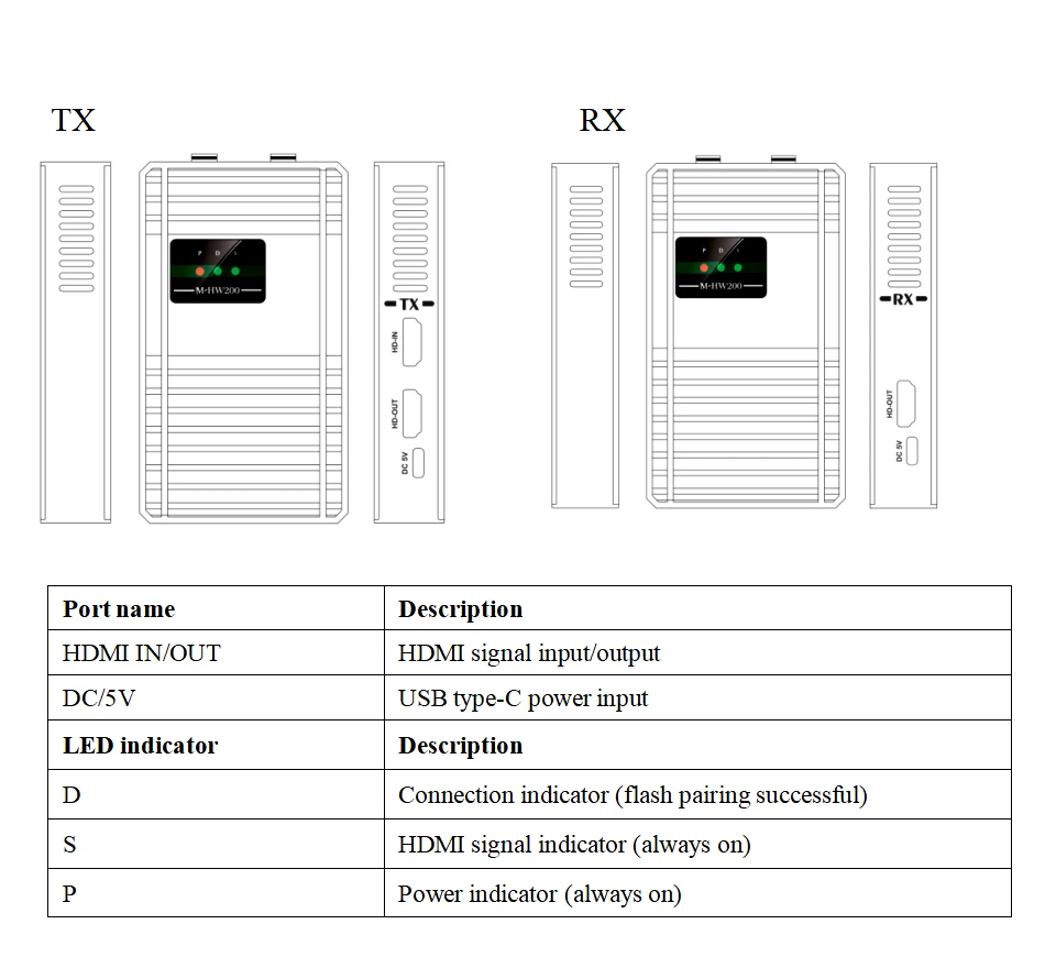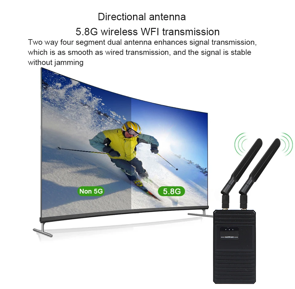 1. 송신기 HDMI 호환 비디오 및 오디오 신호는 최대 5.8G 무선을 통해 최대 200m(656ft)까지 전송됩니다.