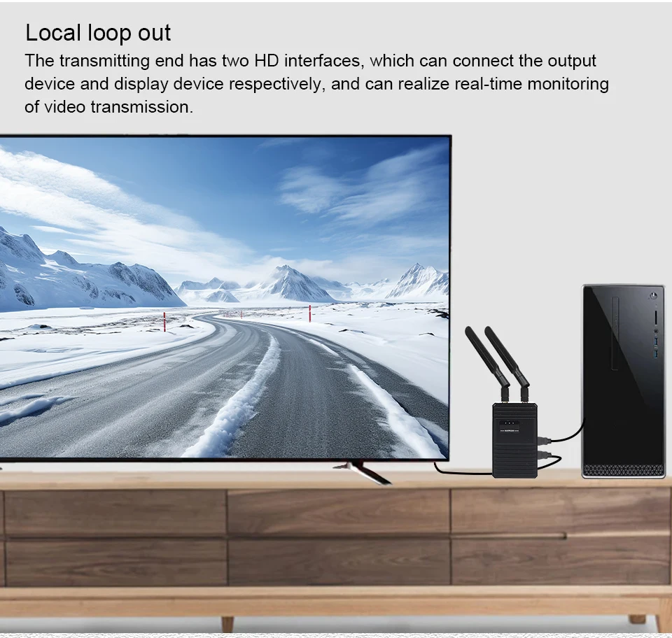 무선 전송은 5.8G 무선 신호를 통해 고화질 오디오 및 비디오 신호를 전송하며 다양한 복잡한 애플리케이션 환경에 적응할 수 있습니다.이 장치는 뛰어난 이미지 처리 및 전송 기능을 갖추고 있어 신호 전송이 더욱 원활하고 안정적입니다.안정적이고 고성능이며 효율적인 HDMI 호환 신호 확장 모드입니다.