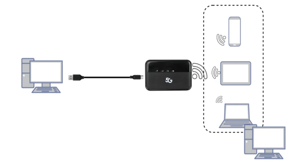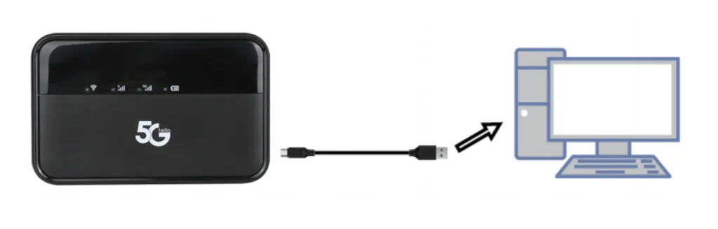 컴퓨터 및 노트북은 인터넷 접속을 위해 Type C 케이블을 통해 5G MiFi M3에 연결할 수 있습니다.