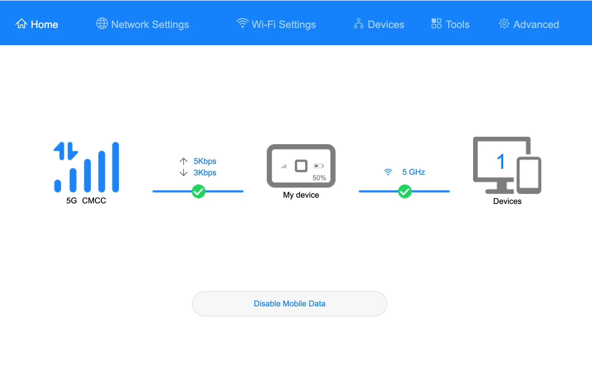 1.장치가 WiFi 또는 USB TypeC 케이블을 통해 5G MIFI에 연결되어 있는지 확인하세요.