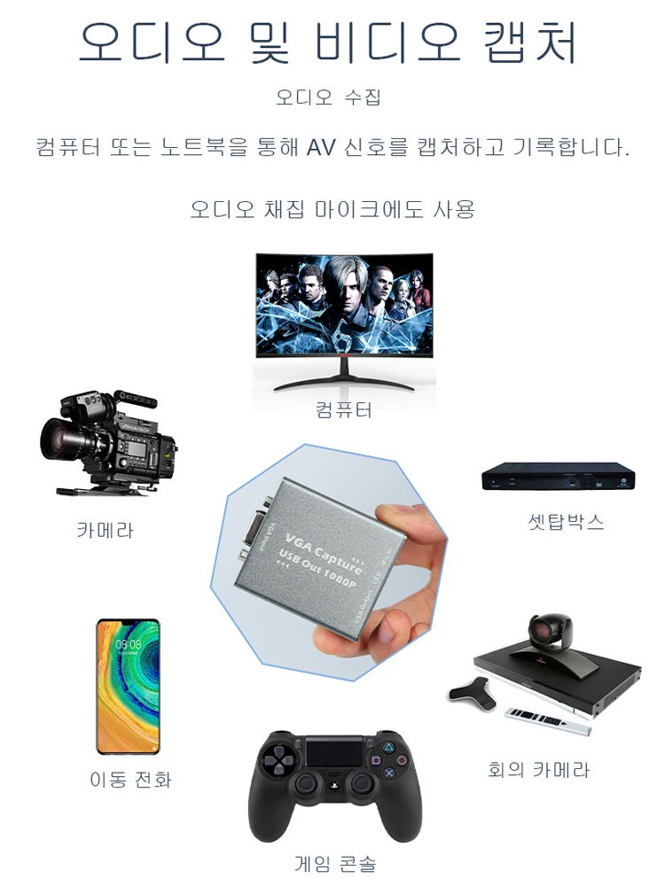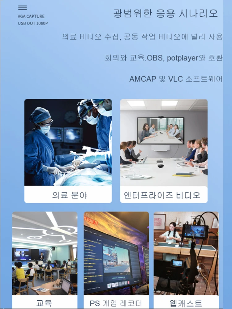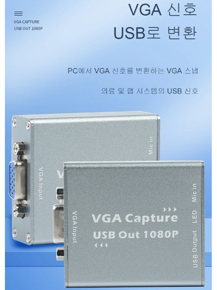 VGA 캡처는 VGA 신호 형태 PC, 의료 기계 및 실험 기계를 USB 신호로 변환합니다. 컴퓨터 나 노트북을 통해 AV 신호를 캡처하고 기록합니다. 오디오 픽업 용 마이크도 사용할 수 있습니다. 의료 비디오 캡처, 협력 비디오 회의, 교육에 널리 사용되며 OBS , potplayer , AMCAP 및 VLC 소프트웨어와 호환됩니다.