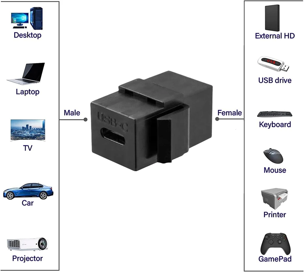커넥터 1: USB 3.1 TypeC 키스톤 암 잭. 커넥터 2: USB 3.1 TypeC 키스톤 암 잭.USB 3.1 TypeC 키스톤 삽입기는 두 개의 USB TypeC 케이블 수를 연결합니다. USB TypeC 3.1 USB 키스톤은 키스톤 잭용 패치 패널이나 벽면 플레이트의 표준 개구부에 맞습니다.