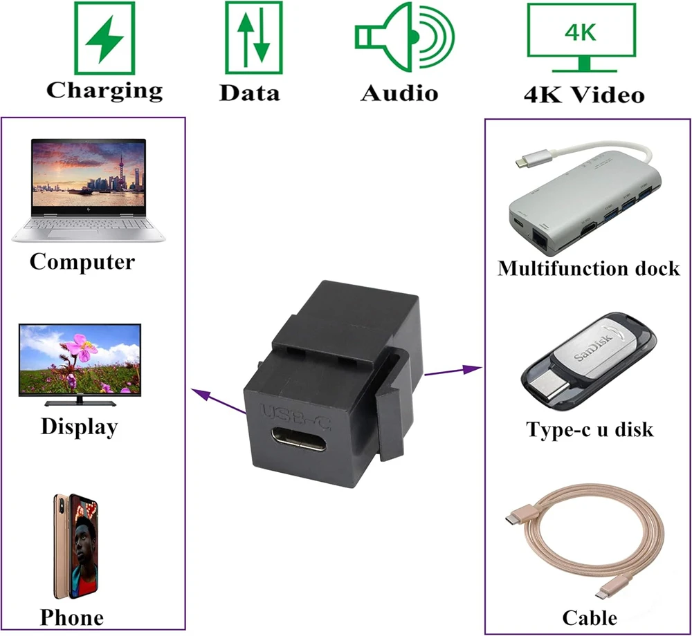 PC, 데스크탑, 노트북, 스마트폰과 같은 USB TypeC 포트가 있는 장비를 연결합니다. 삼성기기 호환 호환 호환 Galaxy Note 8, 삼성기기 호환 호환 호환 Galaxy S8 Plus, LG 호환 호환 호환 V30, G6, G5, V20, ChromeBook Pixel, New와 같은 대부분의 USB C 장치와 호환됩니다. 맥북제품 호환 등.벽면 플레이트를 통해 케이블이 벽 뒤에 숨겨져 있는 USB TypeC가 있는 기타 장비.