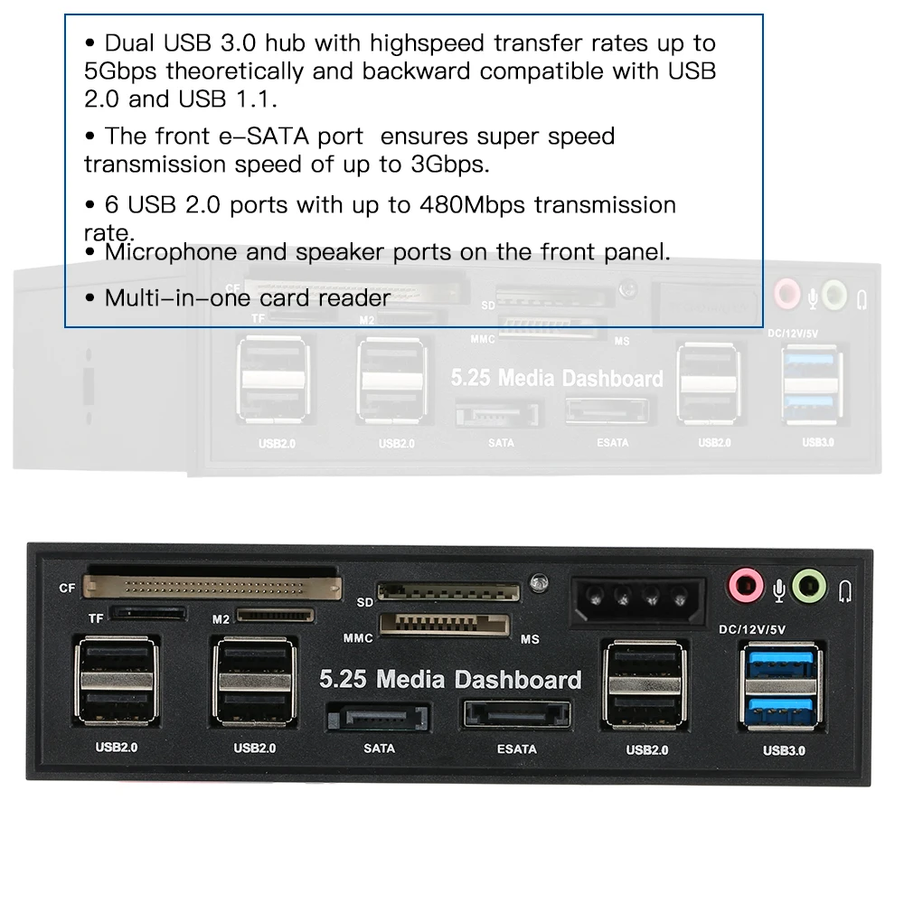 1*5.25 "내부 SATA ESATA 듀얼 USB 3.0 6 USB 2.0 5inone 카드 리더 다기능 전면 패널 미디어 대시보드