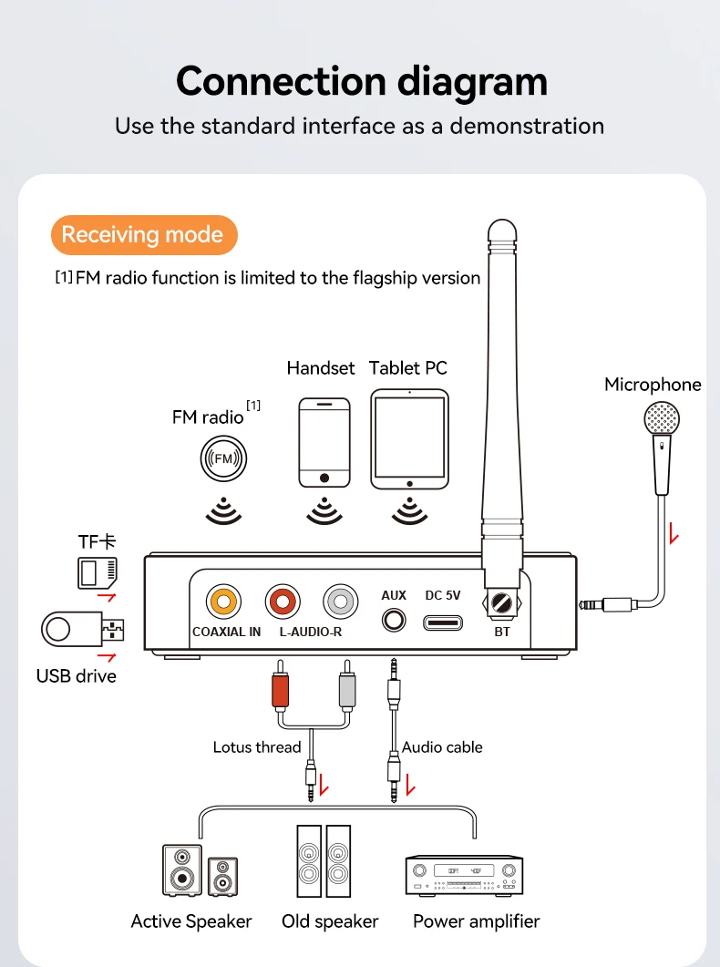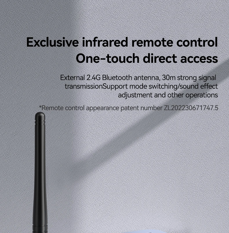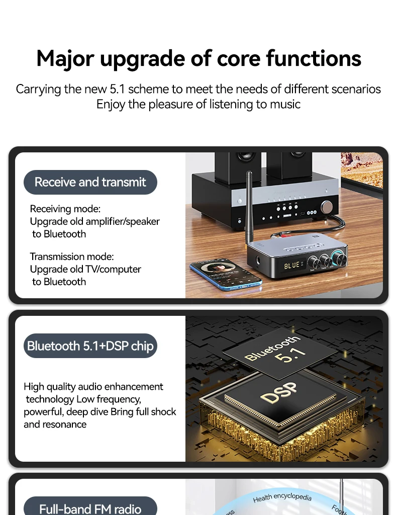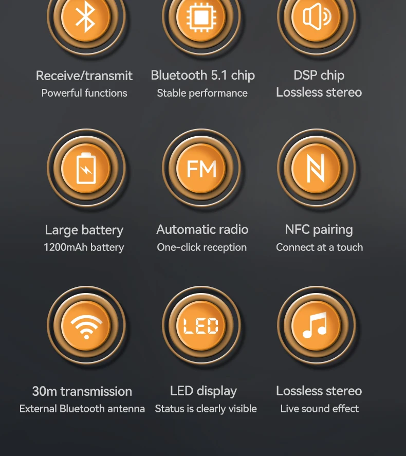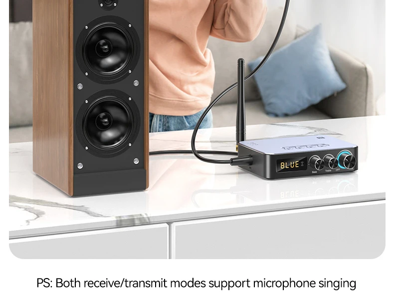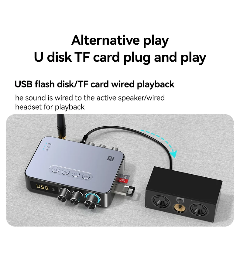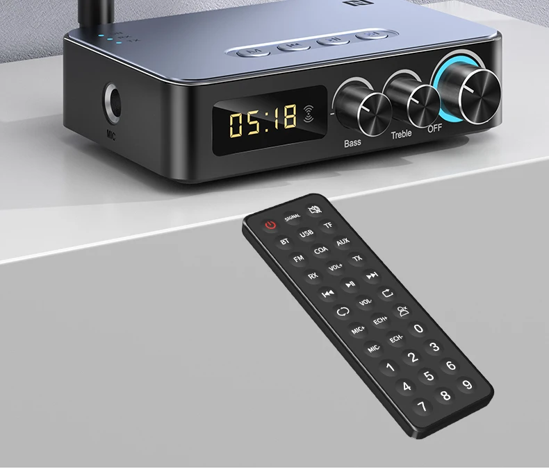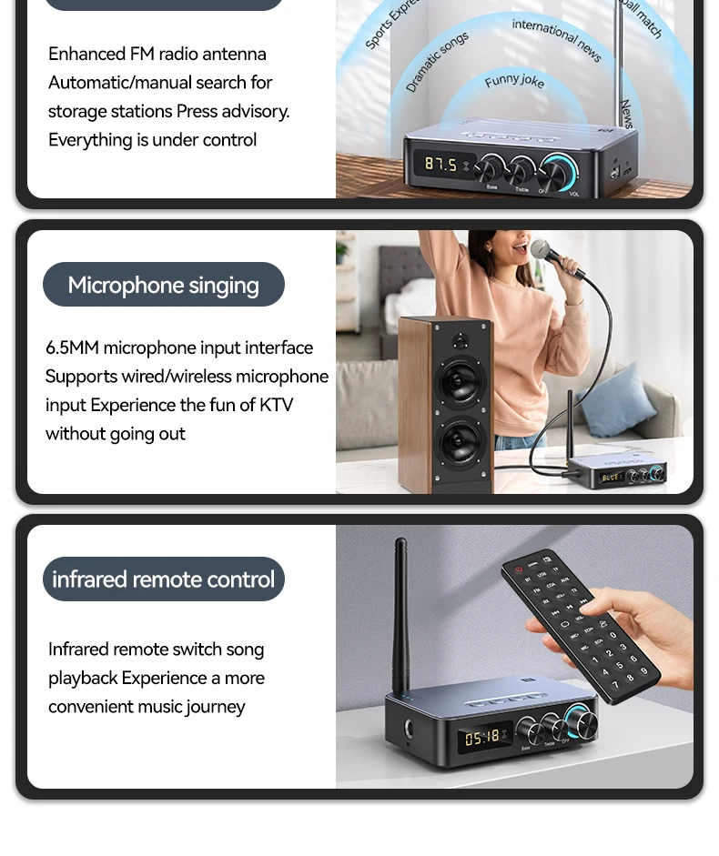 기본 기능: 블루투스 수신기, 블루투스 송신기, U 디스크 재생, TF 카드 재생, 적외선 원격 제어, NFC 터치, 마이크 노래, 조정 가능한 고음 및 저음, HD 디지털 디스플레이, DSP, NFC