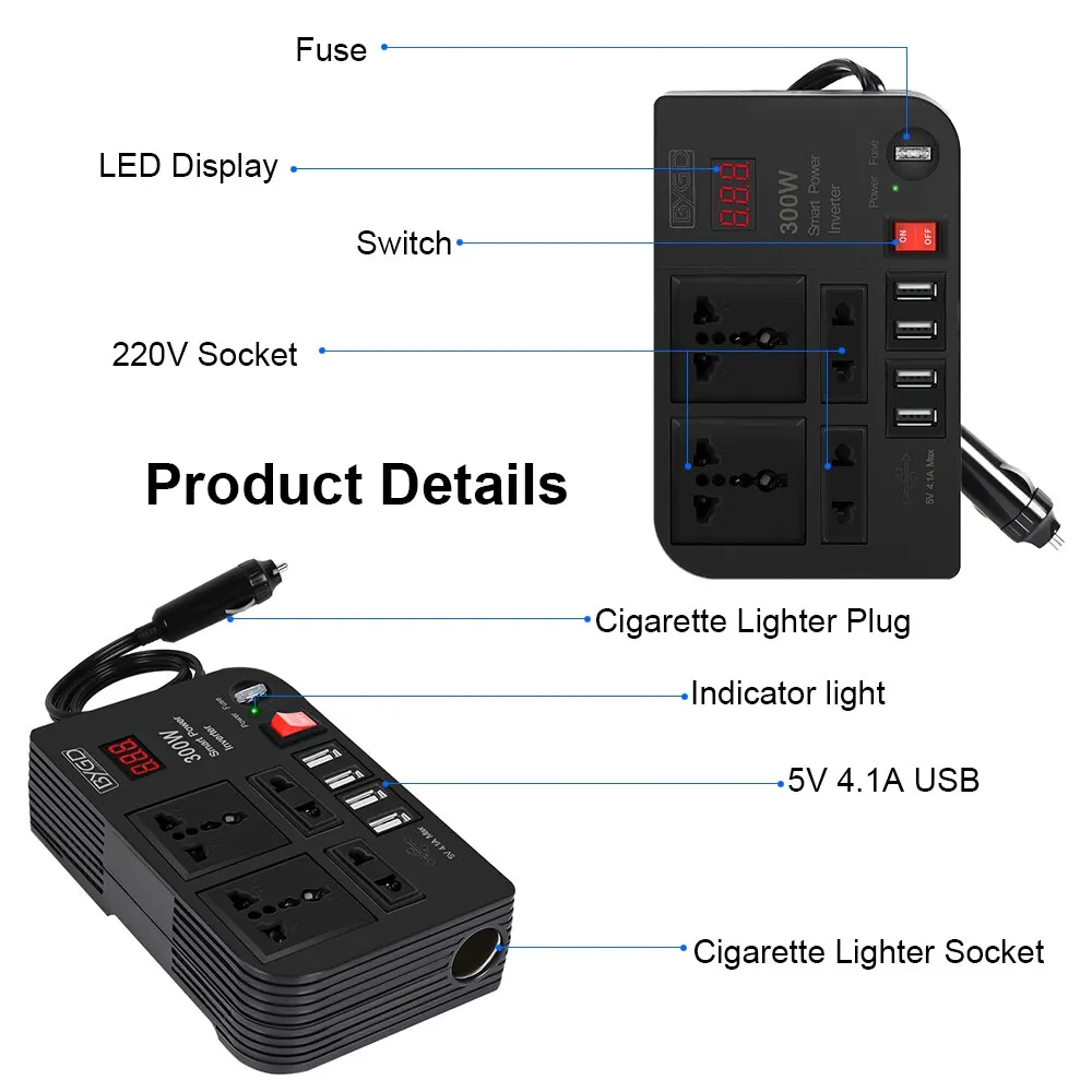 ? 넓은 전압 범위:300W DC를 AC 220 V로 변환 할 수있어 다른 국가에서 사용하기에 적합합니다.