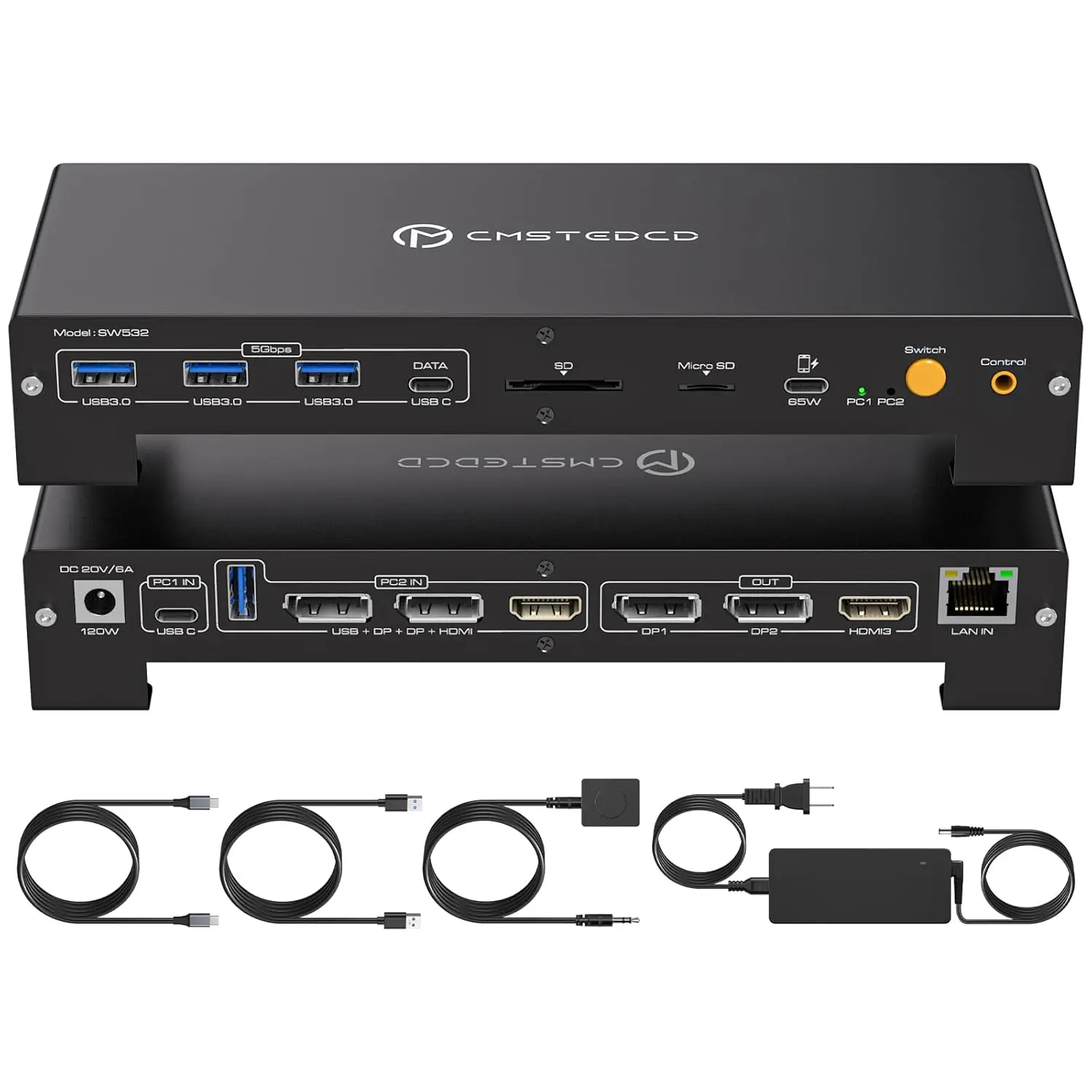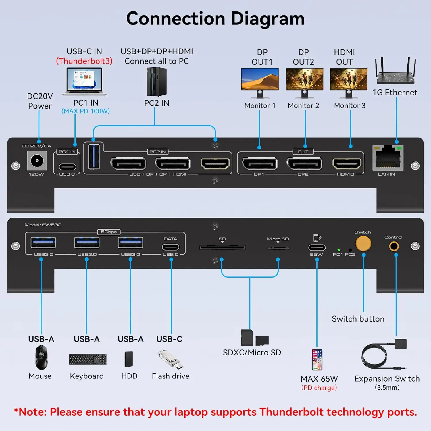 【강력한 KVM 도킹 스테이션】: 이 KVM 스위치를 사용하면 업무용 노트북과 개인용 컴퓨터가 모니터 3개와 키보드 마우스 1세트를 공유할 수 있을 뿐만 아니라 USB 3을 포함한 15 in 1 도킹 스테이션을 공유할 수 있습니다.USB C 날짜 포트 0개;디스플레이 포트;HDMI 포트;기가비트 이더넷 포트;마이크로 SD/SD 카드 슬롯 등; 노트북에 60W 고속 충전 및 100W POWER LOGIC 공급 장치를 지원합니다. 생산성, 엔터테인먼트 또는 창의적인 작업을 위한 최고의 도킹 스테이션입니다.