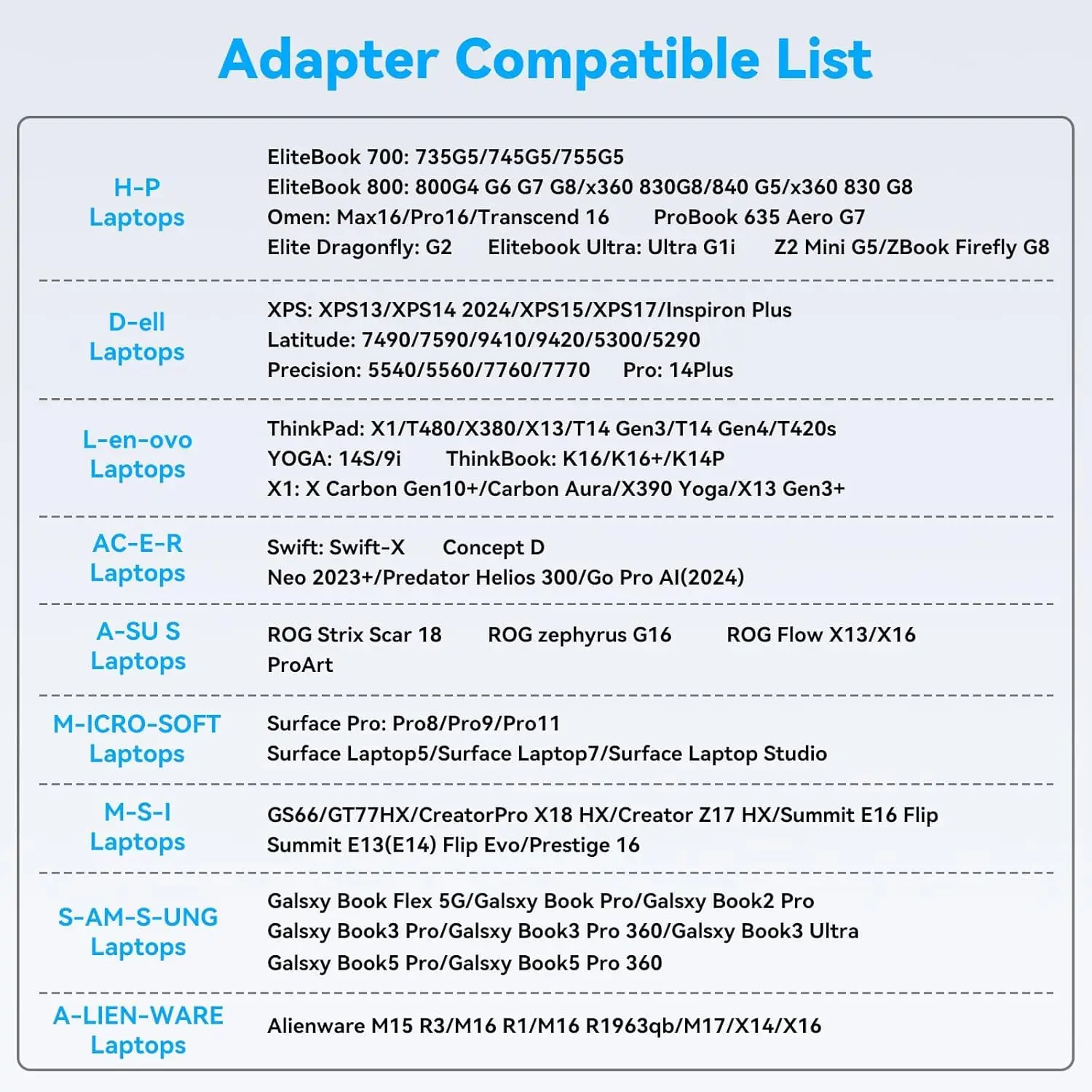 【호환성 확인】: USB C 호스트 포트는 노트북의 USB C 포트가 DP Alt 모드 기능 및 데이터 전송을 지원하거나 Thunderbolt 3/4/5 포트가 있는 노트북이 필요합니다.불완전한 호환성 목록: HP 노트북EliteBook 700/800, Omen, Elite Dragonfly, Elitebook Ultra 4선;DEll 노트북XPS, Latitude, Precision, Pro 4선;Lenovo 노트북ThinkPad, YOGA, ThinkBook, X1 4선;Acer호환 노트북Swift, Concept D, Neo 2023+ 4선;AsuS 노트북ROG, ProArt 4선.노트북 특정 모델 또는 다른 브랜드의 호환 모델의 경우 두 번째 메인 사진을 확인하세요. 구매하기 전에 노트북이 호환되는지 확인하기 위해 저희에게 연락하실 수도 있습니다.