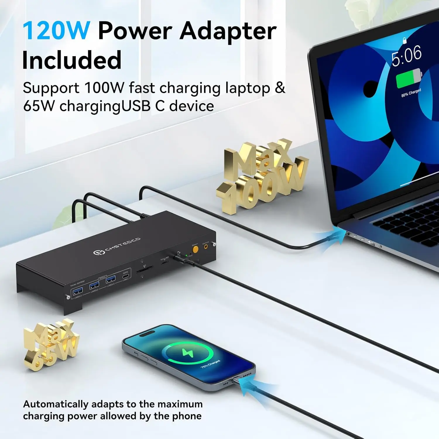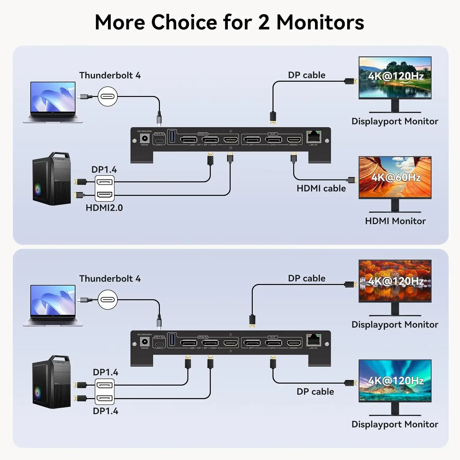 【4K@60Hz 트리플 디스플레이 및 4K@120Hz 듀얼 디스플레이】: 스프레드시트, 비디오 편집 또는 거래 화면을 위한 3개의 디스플레이(4K@60Hz)로 효율성을 극대화합니다.부드러움이 필요한 경우; 듀얼 DisplayPort 4K@120Hz는 디자이너와 게이머에게 반응성이 뛰어난 성능을 제공합니다.참고: 4K@120Hz는 두 개의 DP 모니터를 사용할 때만 달성할 수 있습니다. 노트북 컴퓨터가 Thunderbolt 4를 지원해야 합니다.