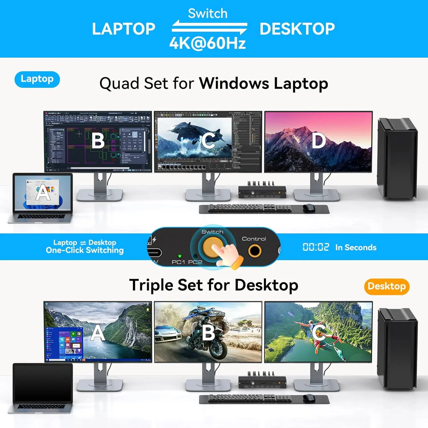 【100W KVM 스위치】: 100W PD 패스스루 충전(노트북) + 전용 65W USBC 포트(휴대폰/태블릿)로 장치의 전원을 유지하세요.포함된 120W 어댑터는 연결된 모든 장비에 안정적인 전원을 보장하므로 더 이상 케이블이 복잡해지지 않습니다!