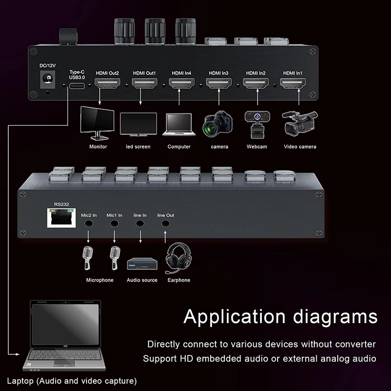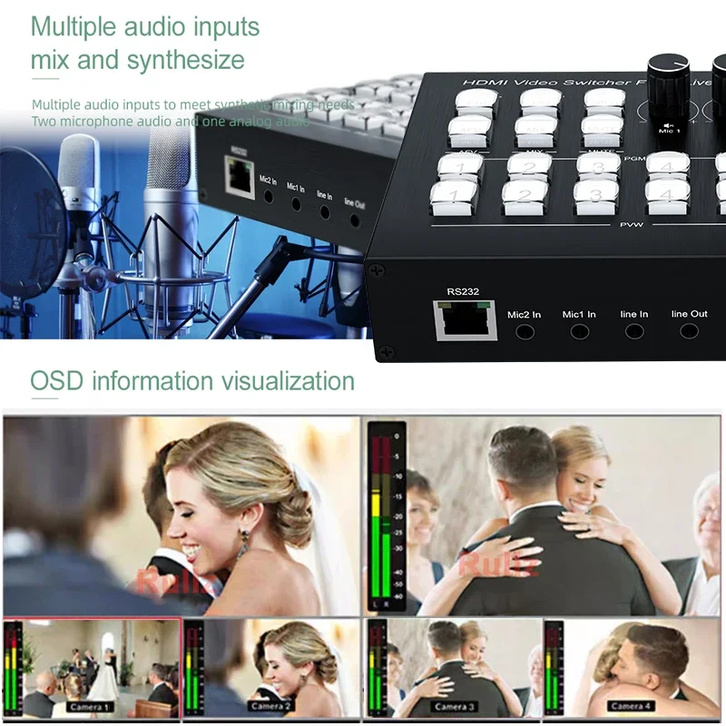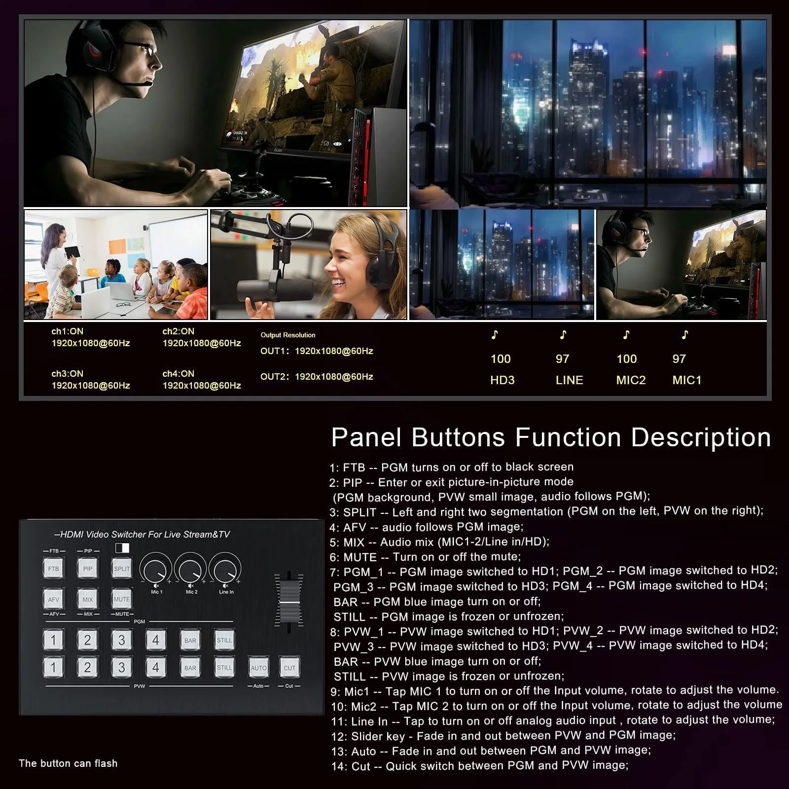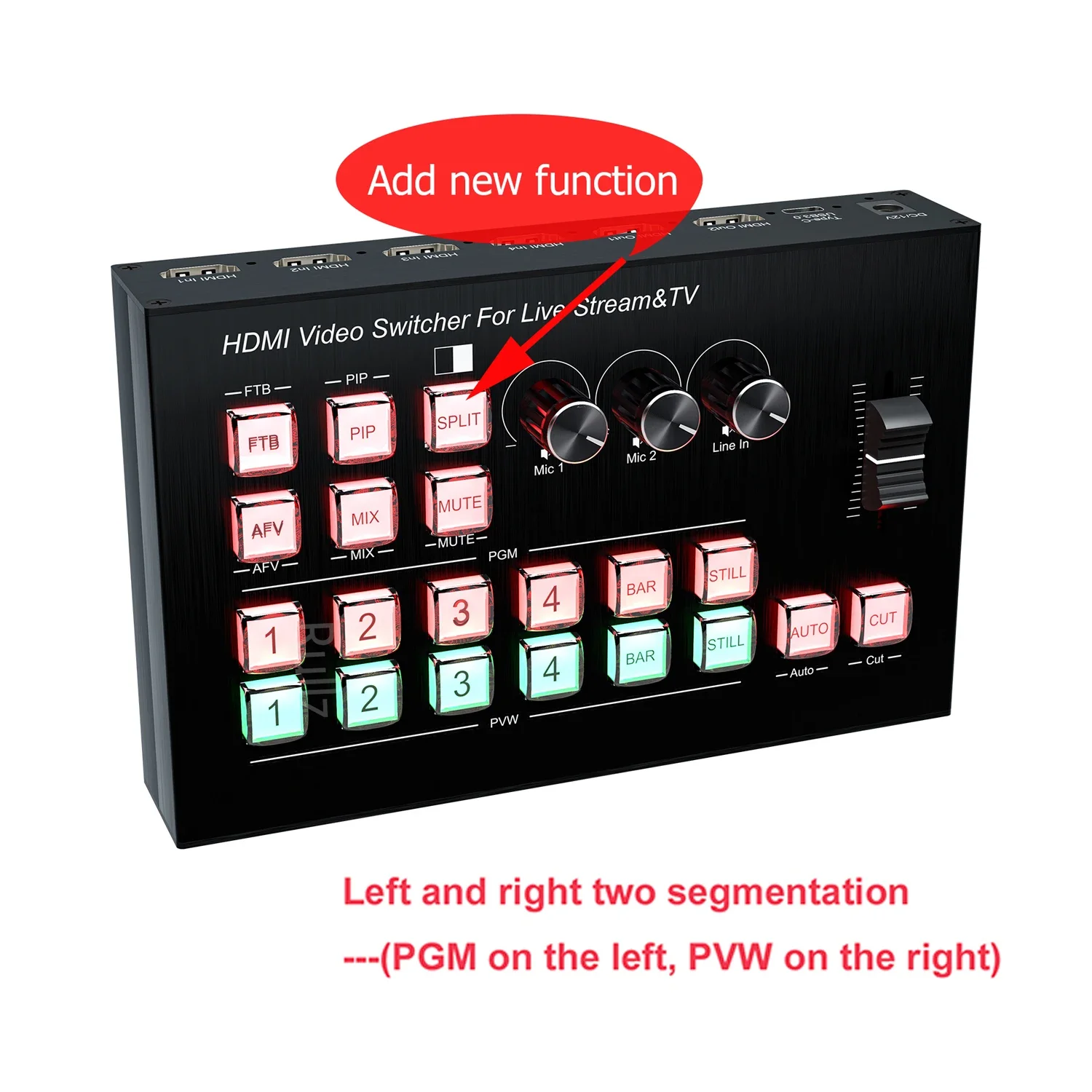 라이브 스트리밍용 비디오 스위처, 4개의 HDMI 입력은 4K@30Hz 해상도를 지원하고 HDCP1.4 표준을 지원합니다.
