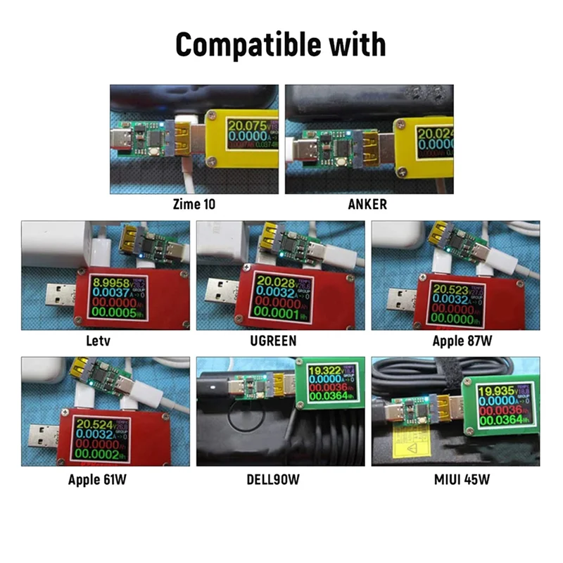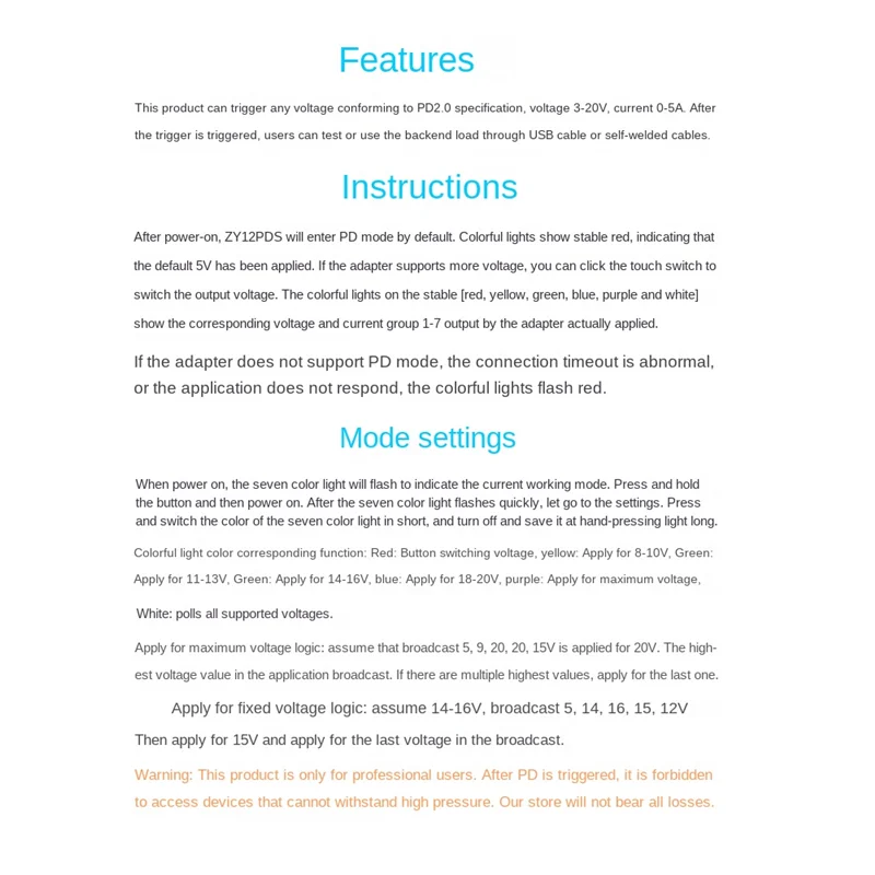 이 제품은 PD2.0 표준을 따르는 모든 전압을 트리거할 수 있으며 USB 또는 케이블을 통한 부하 테스트에 사용할 수 있습니다.