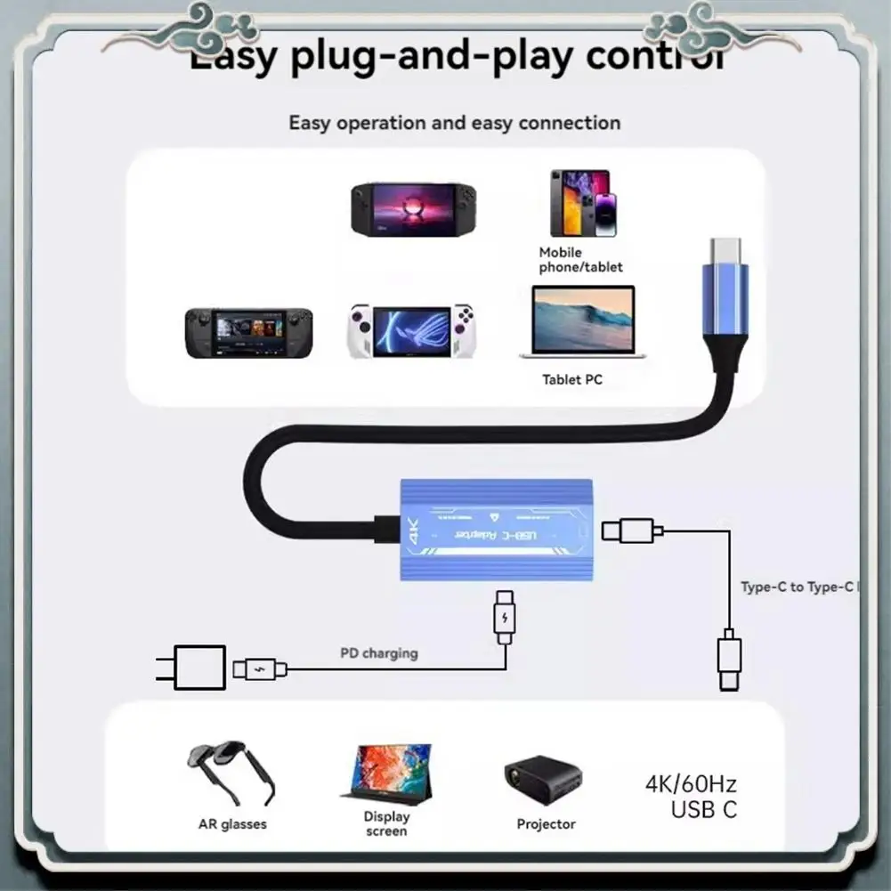 4K@60Hz Ultra HD: USB CType C 어댑터는 4K@60Hz 초고화질 전송을 지원하여 스마트 안경, 디스플레이 화면 및 프로젝터의 대형 화면에서 최고의 시각적 향연을 즐길 수 있습니다.