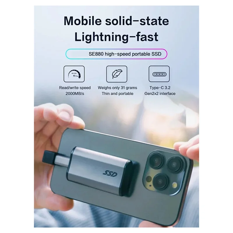[1].Elite SE880 외장 SSD: Elite SE880은 이동 중에도 생산성을 발휘할 수 있도록 제작되었습니다.빠른 전송을 위해 USB 3.2 Gen2 x2를 지원하고 TypeC 포트를 갖추고 있으며 최대 2000MB/s의 성능을 제공합니다.이 모든 것이 케이스보다 작은 28cc의 부피로 컴팩트한 폼 팩터에 담겨 있습니다.이러한 특성으로 인해 이동 중에도 생산성과 창의성을 발휘할 수 있습니다.