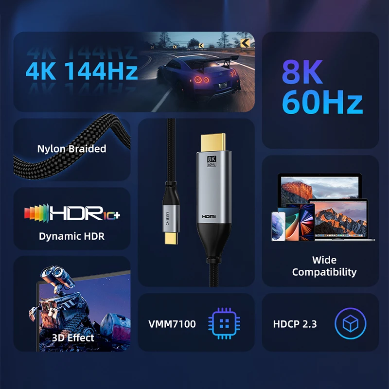 USB Type C to HDMI 2.1 케이블에는 튼튼한 꼰 나일론 재킷, 알루미늄 하우징 및 VMM7100 칩이 있어 안정적인 신호와 긴 수명을 보장합니다.