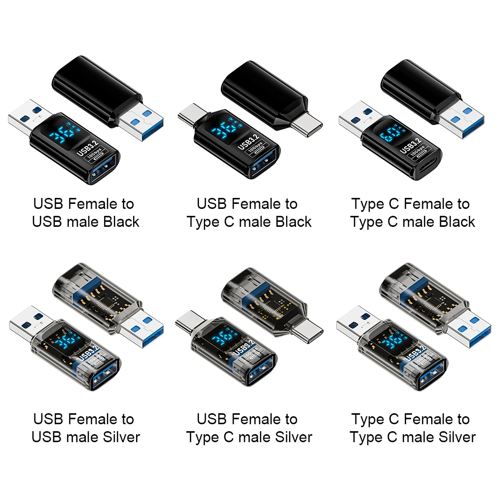 디지털 디스플레이 USB Type C 충전기 변환기 10Gbps TypeC USB 확장 어댑터 60W 범용 휴대 전화 노트북 태블릿 사양: 원산지: 중국 본토 색상: 퓨어 블랙/실버(옵션) 자료: PC 전송 속도: 10Gbps 무게: 5.6g 크기: 33.00x12.50x7.50mm/1.3x0.49x0.3인치 기능적 차이: USB3.2 A 남성 - C 여성: 전력: QC 모드: 36W(12V@3A)/PD 모드: 60w(20V@3A) 기능: 데이터 전송/충전 USB3.2 남성에서 여성으로: 전력: QC 모드: 36W(12V@3A) 기능: 데이터 전송/충전, 양방향 전송 지원 USB3.2 C 남성 - A 여성: 전력: QC 모드: 36W(12V@3A) 기능: 데이터 전송/충전