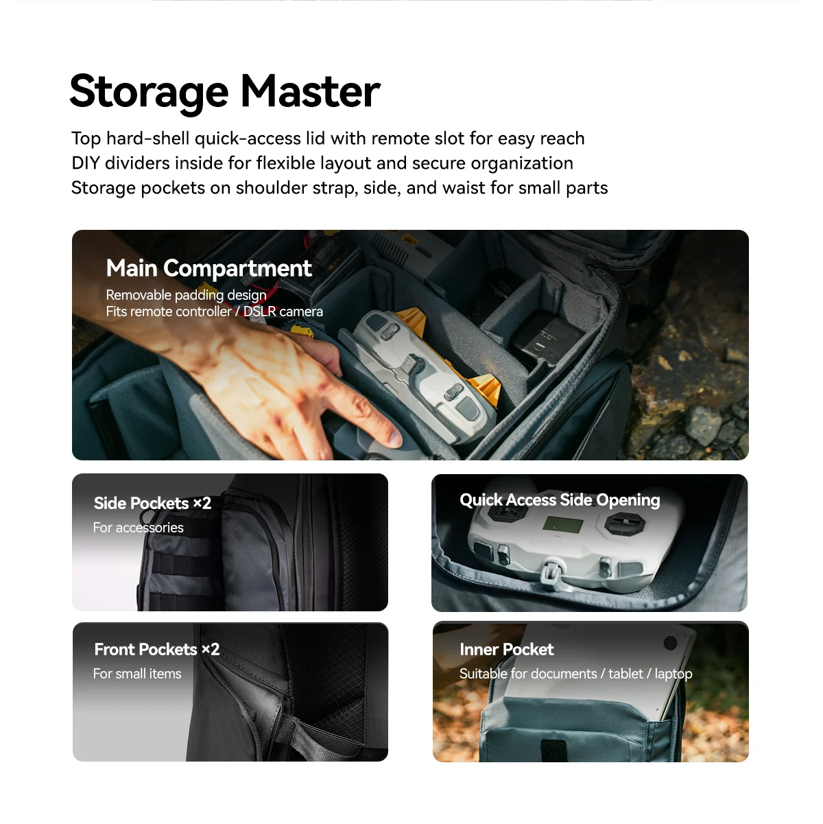 iFlight FPV 드론 백팩은 새롭게 업그레이드되어 장비 운반 요구 사항에 맞게 향상된 기능과 내구성을 제공합니다.이제 장비 운반을 위한 최고의 여행 동반자가 되었습니다.상단과 하단 레이어가 있는 메인 수납공간을 포함해 6개의 수납 공간이 있습니다. 상단에는 리모컨을 보관하고 하단에는 분리 가능한 내부 가방이 있는 DSLR 카메라를 보관할 수 있습니다.내부 포켓은 파일, 태블릿, 노트북을 보관하기에 적합합니다.