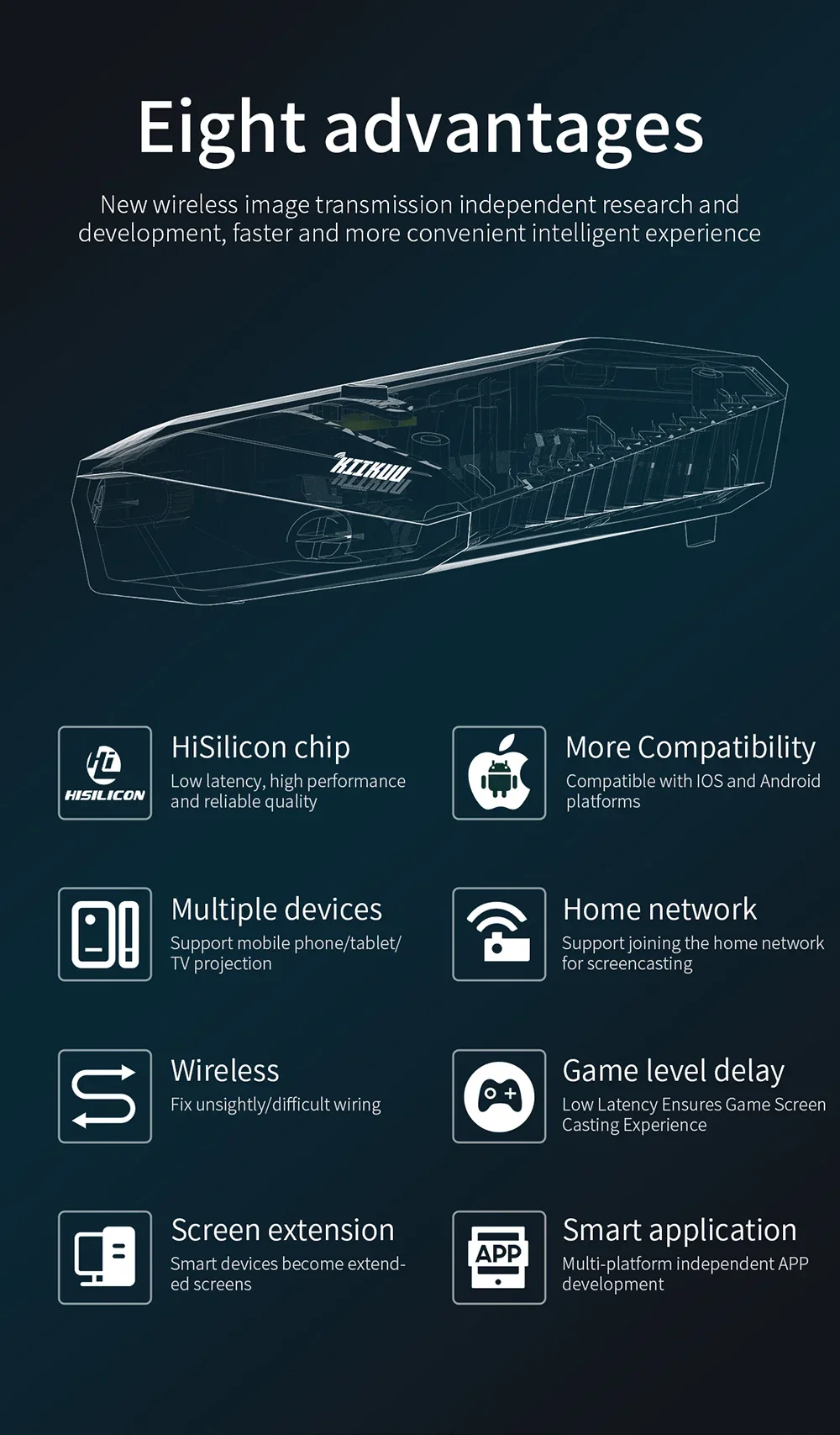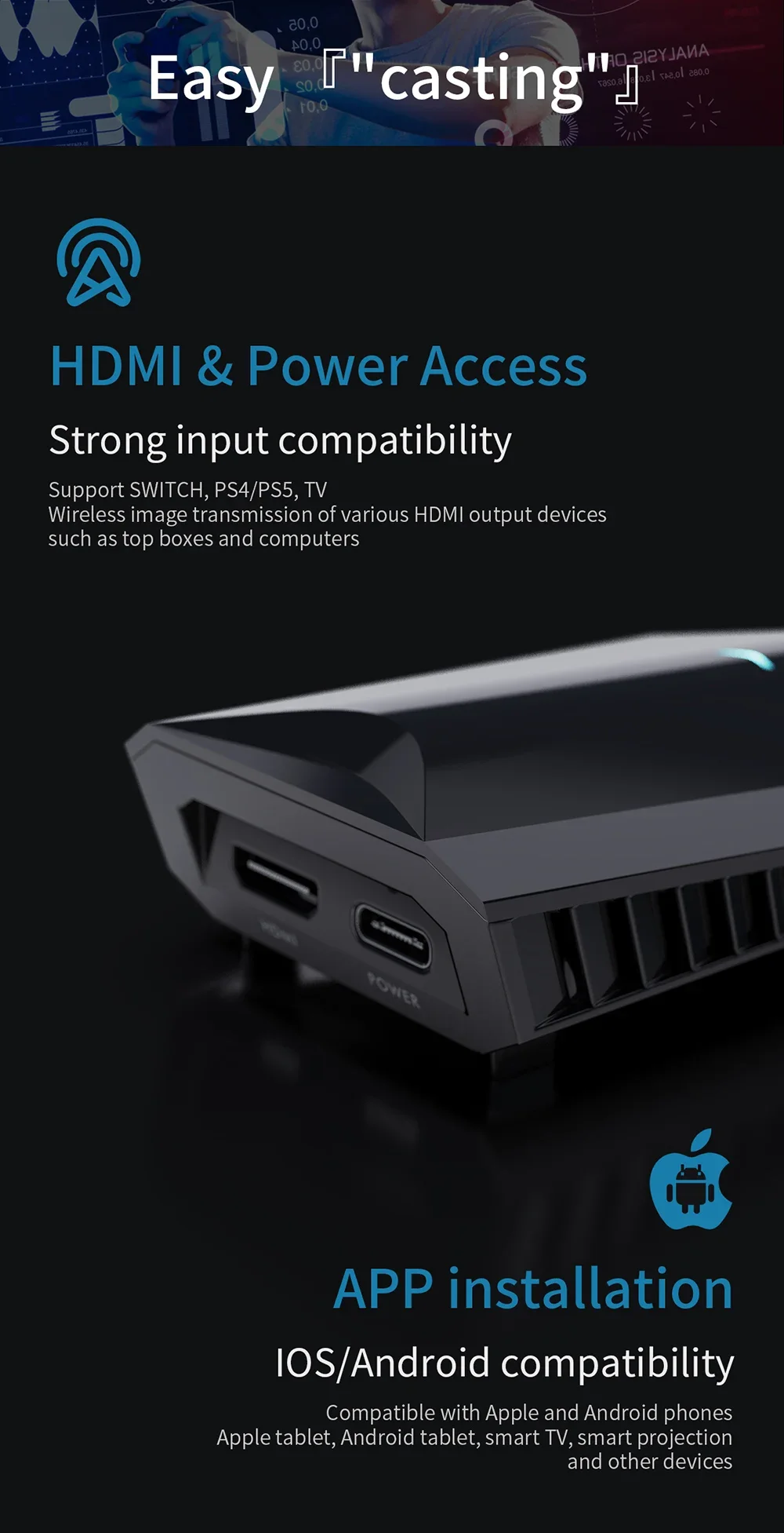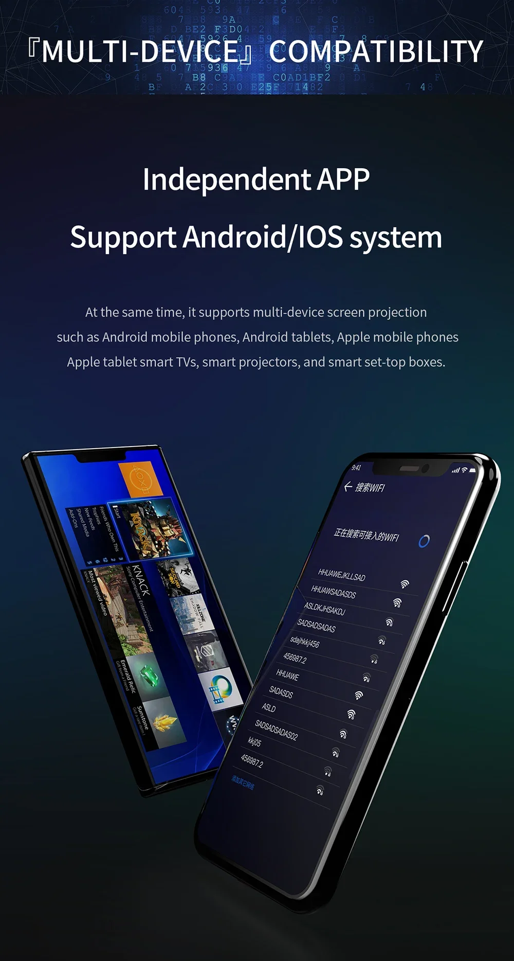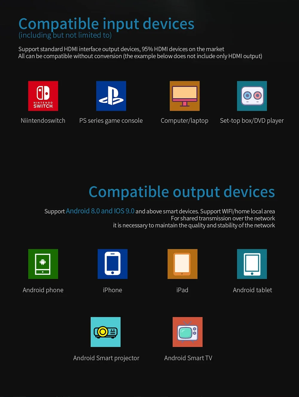 지원되는 출력 장치: Android 8.0 및 IOS 9.0 이상의 스마트 기기, 스마트 TV, 스마트 프로젝터, 아이패드 호환 호환 호환 호환, 애플제품 호환 호환, Android 폰 태블릿 등을 지원합니다.
