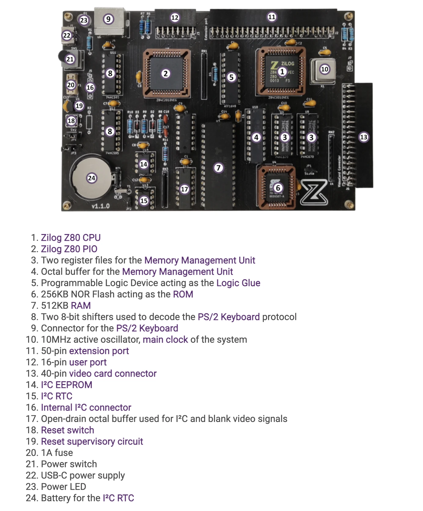 이 제품에는 사전 조립, 사전 플래시 및 사전 테스트 된 Zeal 8 비트 컴퓨터 마더 보드가 포함되어 있습니다. A 구성 요소의 전체 목록은 다음과 같습니다.