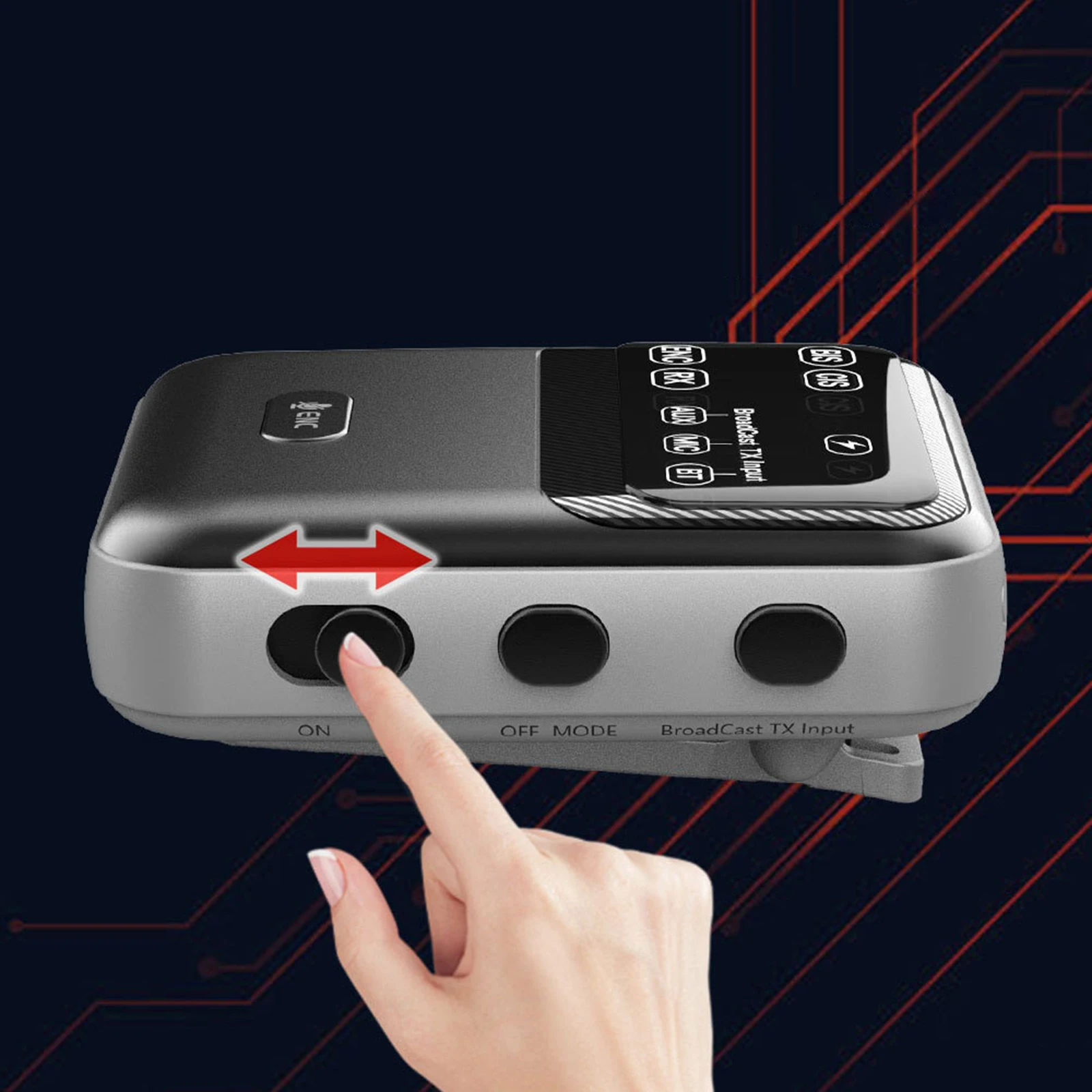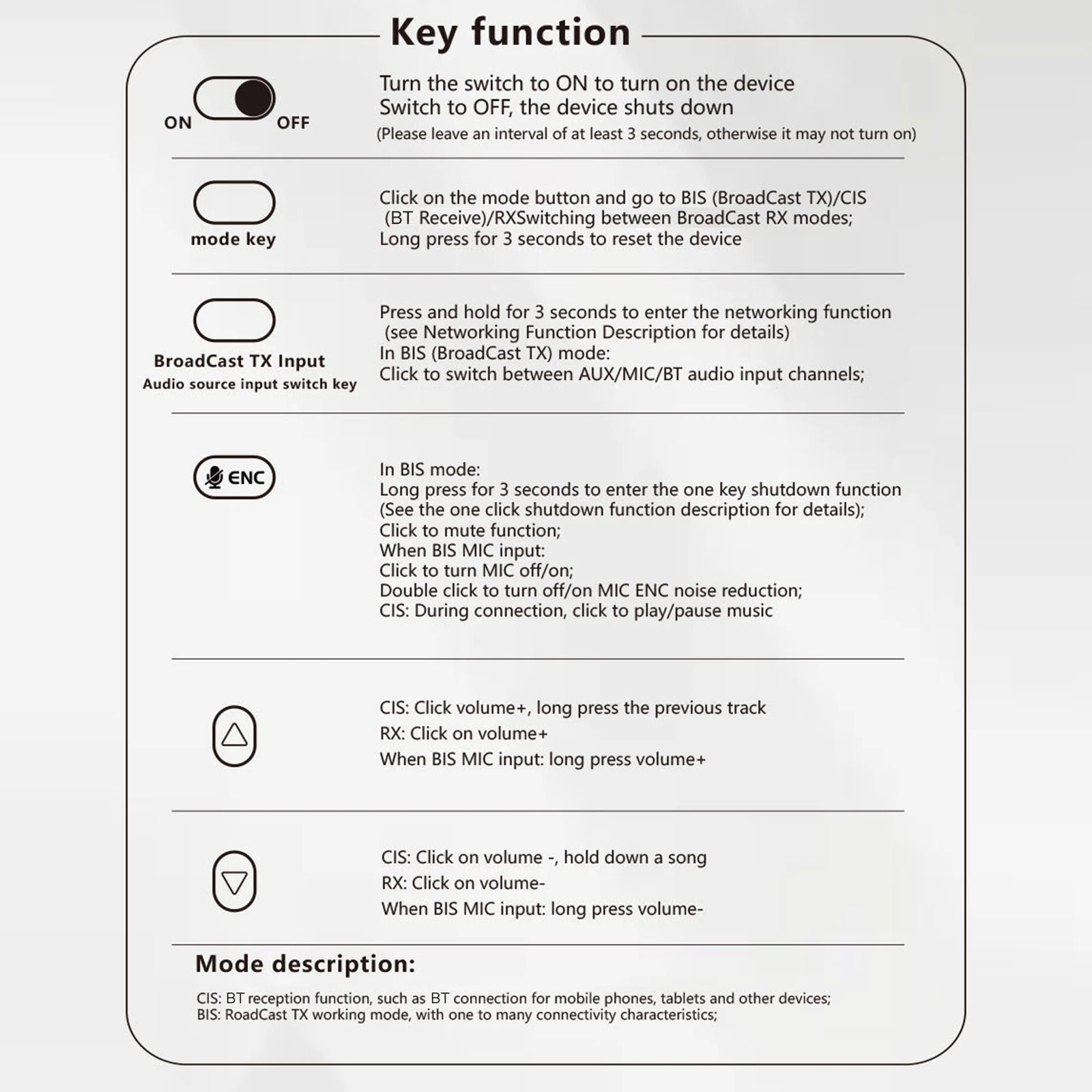 특징: 1.BIS 무선 방송 기능: 강력한 오디오 수신기를 사용하여 한 번에 여러 RX 방송 수신기로 오디오를 간편하게 전송하세요.N개의 수신기를 동시에 연결하여 유연한 설정을 위한 안정적인 무선 오디오 전송을 보장합니다. 2. 유연한 방송 수신: 무선 방송 송신기를 활용하여 모든 tx 방송 소스에서 오디오를 수신하고 스피커를 통해 사운드를 확장합니다.방과 청중 전체에 걸쳐 공지 사항이나 음악을 증폭시키는 데 적합합니다. 3. 다양한 Bluetooth 호환 수신: 오디오 수신기 송신기를 사용하면 휴대폰에서 Bluetooth와 호환되지 않는 스피커나 자동차 오디오 시스템으로 오디오를 무선으로 스트리밍할 수 있으므로 표준 시스템을 스마트하고 케이블 없이 만들 수 있습니다. 4. 다중 모드 적응성: 이 enc 무선 방송 3.5mm 오디오 어댑터는 BIS 방송, 블루투스를 지원합니다. -호환 가능 및 보조 모드.마이크, 전화기, TV/컴퓨터 출력 간을 쉽게 전환하여 다양한 환경에서 편의성을 높입니다. 5. 확장 가능한 방송 연결: 회의 진행, 음악 재생, 공지사항 중계 등 원활한 페어링을 위해 무선 방송 어댑터를 사용하세요.복잡한 배선 없이 여러 장치에서 동기화된 사운드를 즐겨보세요. 사양: Bluetooth 호환 버전: 블루투스 호환 V5.4 버전 작동 주파수 대역: 2.402GHz2.480GHz 지원되는 오디오: SBC, AAC, LC3, 방송 오디오 내장 배터리: 550mAh 충전 전류: 약 300mA 충전시간 : 약 2시간 배터리 수명: BIS > 6시간, CIS > 20시간, BroadCast RX > 20시간 충전 방법: TypeC 5V/1A 오디오 입력/출력: 오디오 입력: AUX, MIC, BT; 오디오 출력: AUX 연결 방식: BIS 모드 시 1대N 연결, CIS 모드 시 1대1 연결 참고: