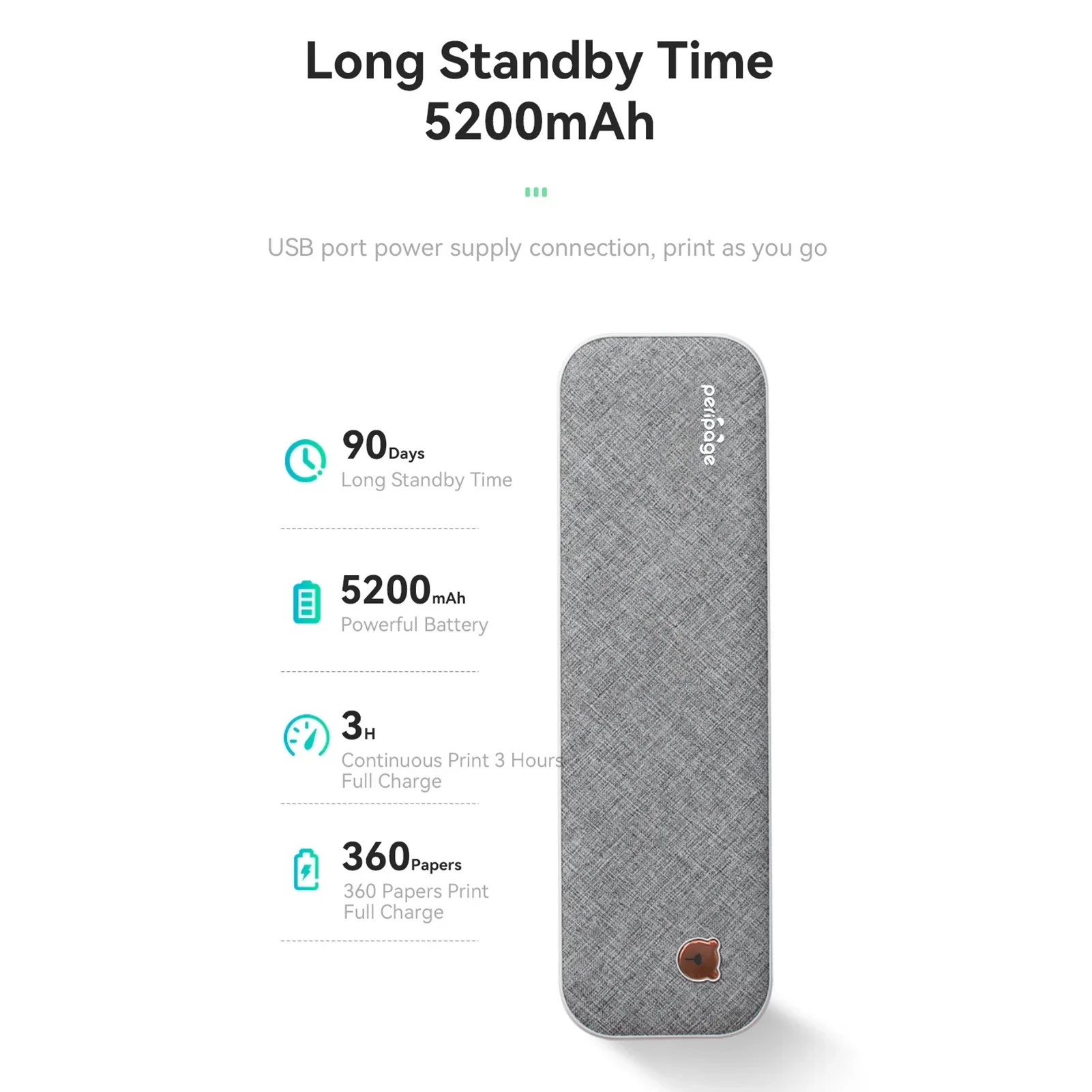 【생활에 편리함】 컴팩트한 크기 - 265x80x45mm/10.4x3.1x1.8in.2600mAh 충전식 배터리 2개가 내장되어 있어 완전 충전 후 3시간 연속 인쇄가 가능하고 대기 시간이 90일로 길어 출장, 학교 등에 휴대하기에 좋습니다.