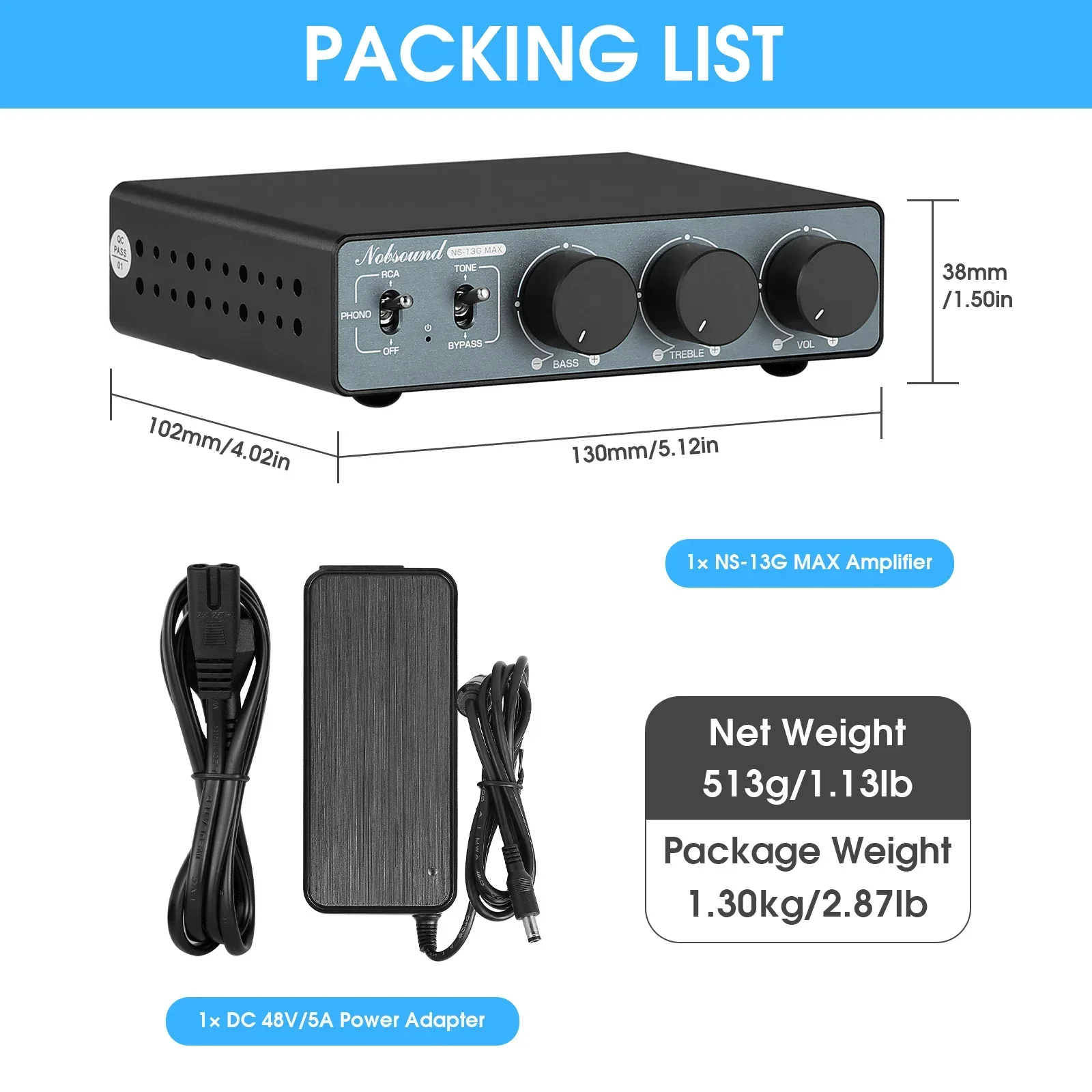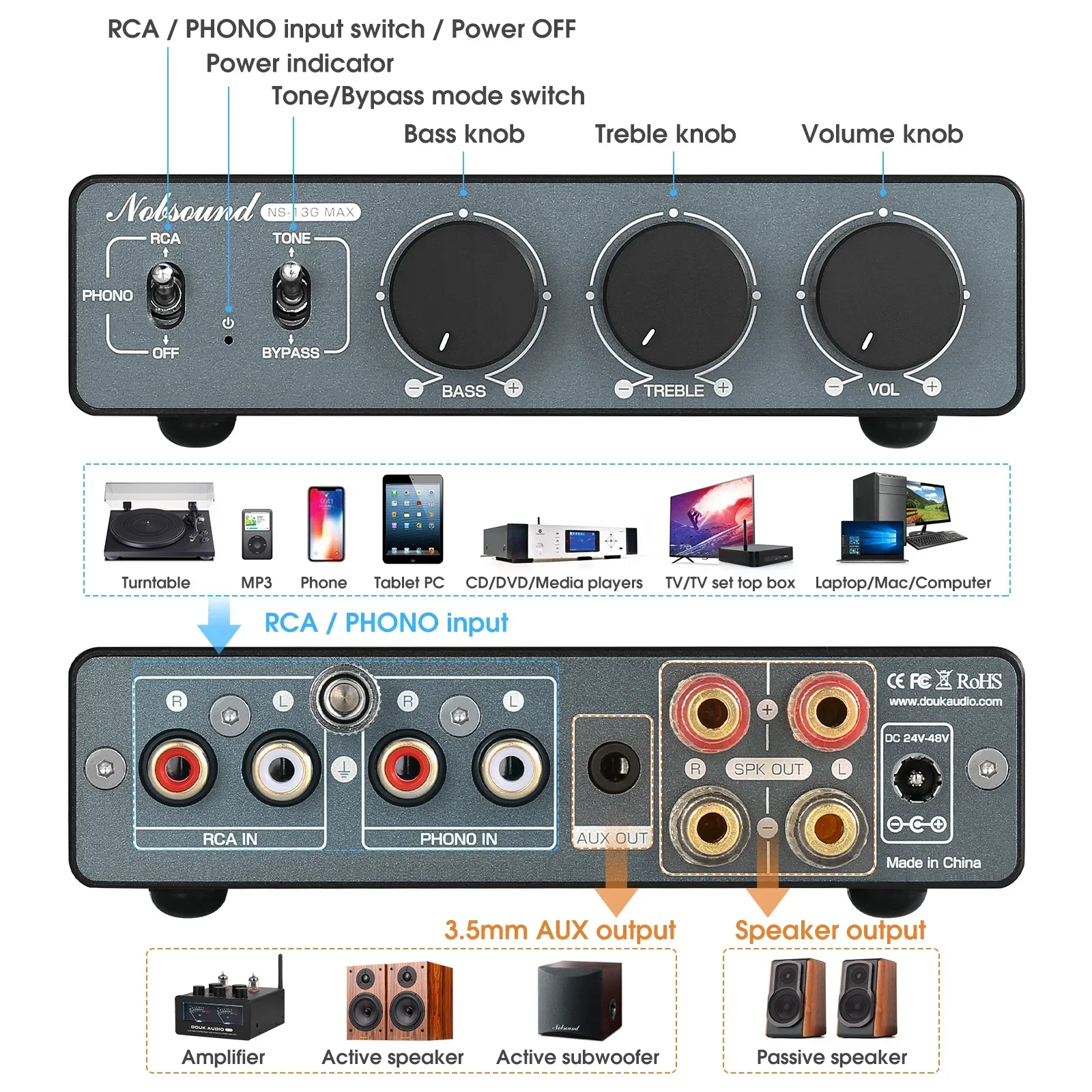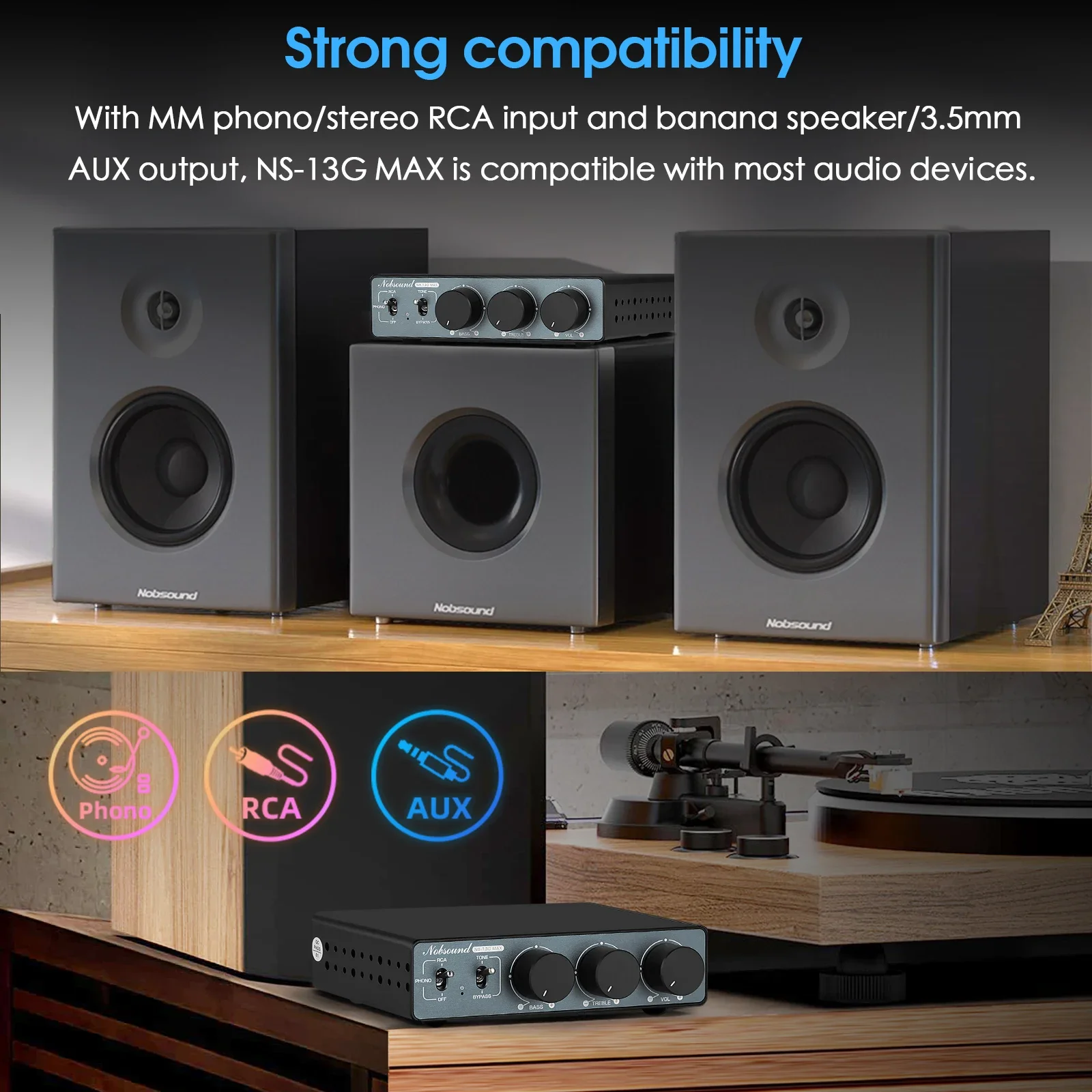 강력한 호환성: 포노/스테레오 RCA 입력을 통해 NS13G MAX는 턴테이블, 노트북, 컴퓨터, CD/DVD 플레이어, TV 등을 포함한 대부분의 오디오 장치와 호환됩니다.바나나 스피커 출력 외에도 3.5mm AUX 출력이 추가되어 다른 앰프나 액티브 스피커/서브우퍼를 연결하여 2.1 또는 다중 채널 오디오 시스템을 구축할 수 있습니다.