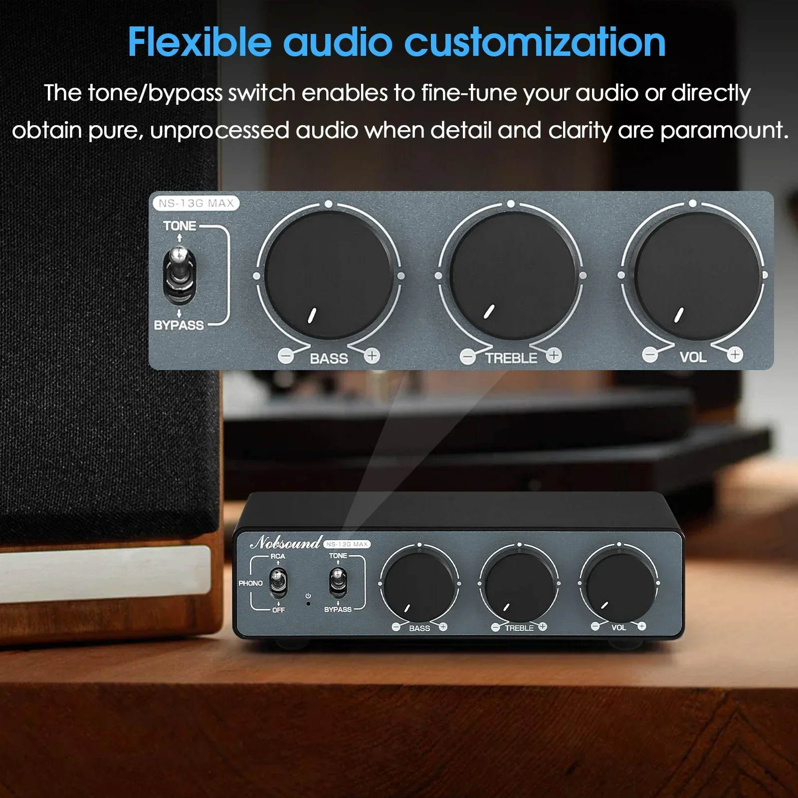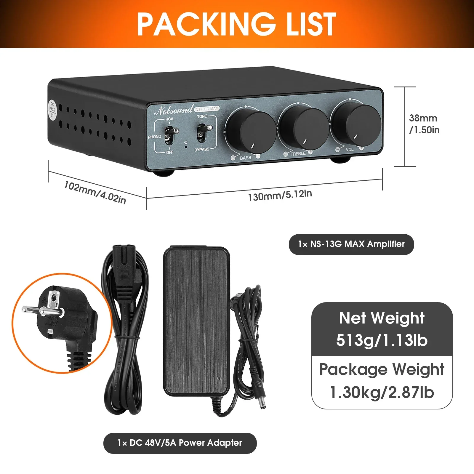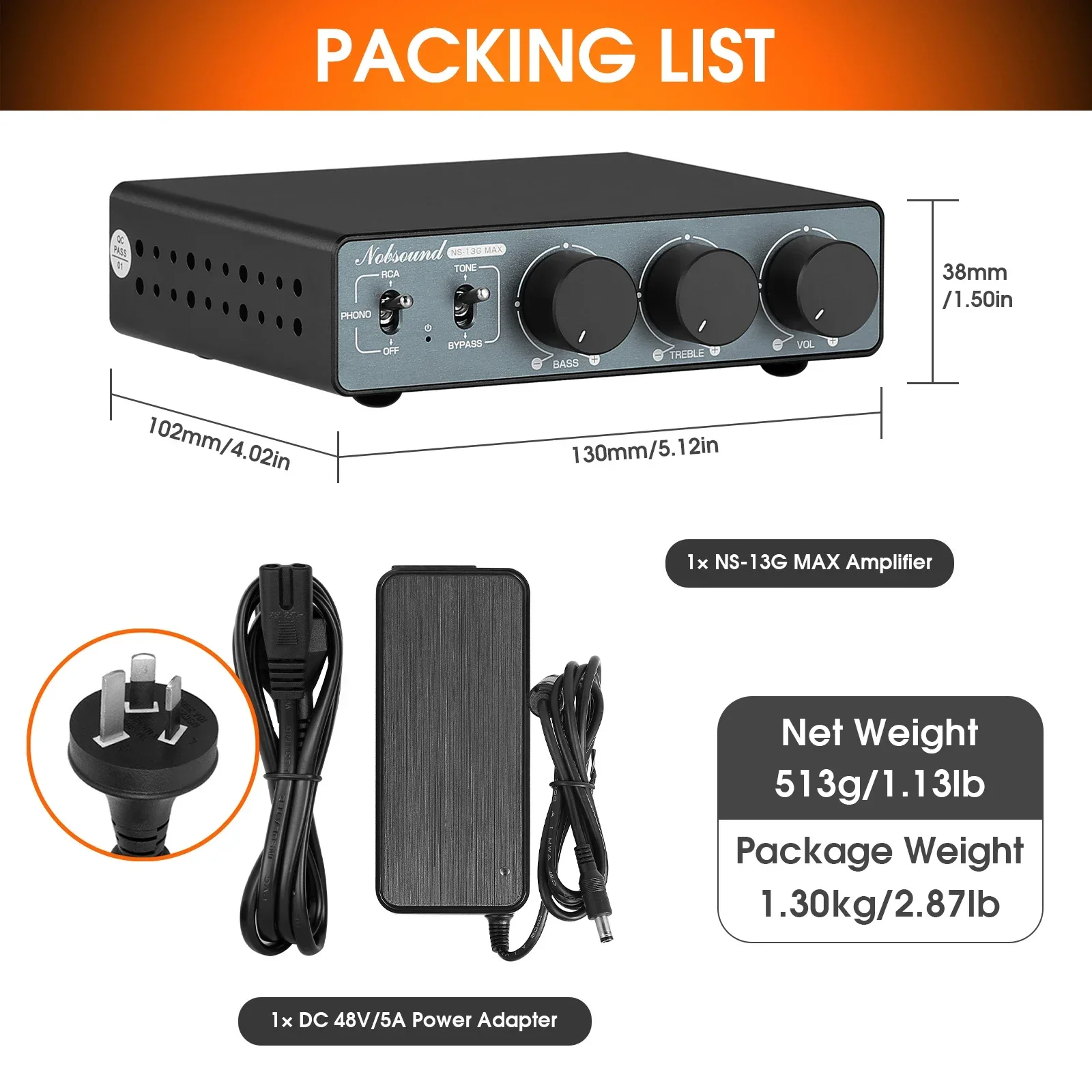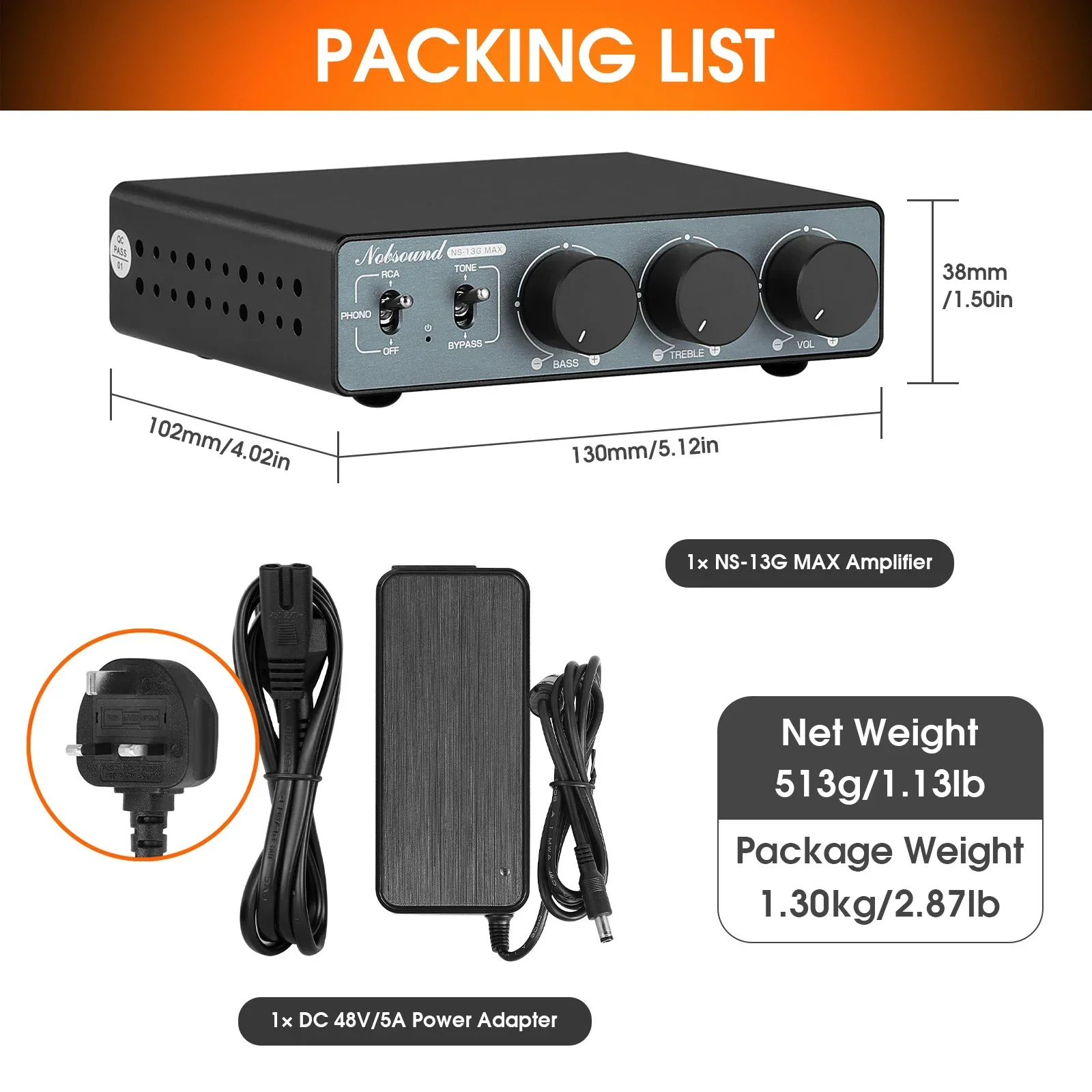 강력한 호환성: 포노/스테레오 RCA 입력을 통해 NS13G MAX는 턴테이블, 노트북, 컴퓨터, CD/DVD 플레이어, TV 등을 포함한 대부분의 오디오 장치와 호환됩니다.바나나 스피커 출력 외에도 3.5mm AUX 출력이 추가되어 다른 앰프나 액티브 스피커/서브우퍼를 연결하여 2.1 또는 다중 채널 오디오 시스템을 구축할 수 있습니다.