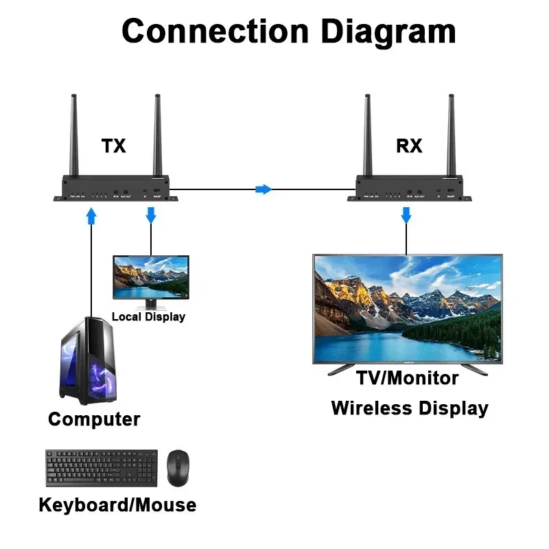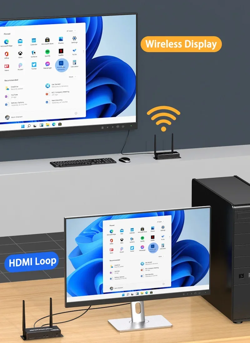 2.4K 30Hz 입력/루프 출력을 지원합니다. 1080P 60Hz 무선 디스플레이.드라이버나 앱을 설치할 필요가 없습니다.