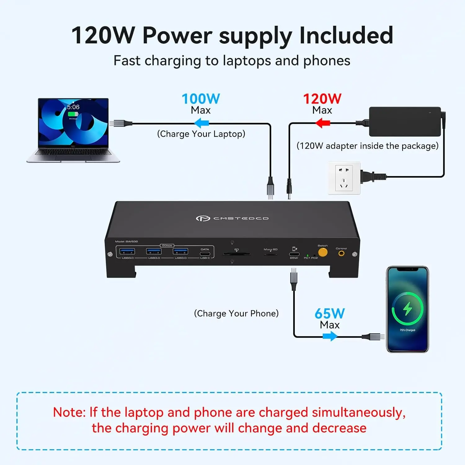 【노트북용 PD100W 충전】이 KVM 스위치 3 모니터에는 120W POWER LOGIC 어댑터 1개가 장착되어 있어 장치에 안정적인 전원을 제공하고 동시에 Thunderbolt 포트를 통해 노트북을 역충전할 수 있으며 최대 전력은 100W에 도달할 수 있습니다.노트북 충전기를 추가로 연결하지 않고도 사용이 편리합니다.또한 하나의 Type C 충전 포트가 함께 제공되어 휴대폰에 최대 65W의 충전 전력을 제공합니다.참고: 사용하려면 POWER LOGIC 어댑터에 연결해야 합니다. 그렇지 않으면 작동하지 않습니다.노트북과 휴대폰을 동시에 충전하면 그에 따라 충전 전력이 감소합니다.