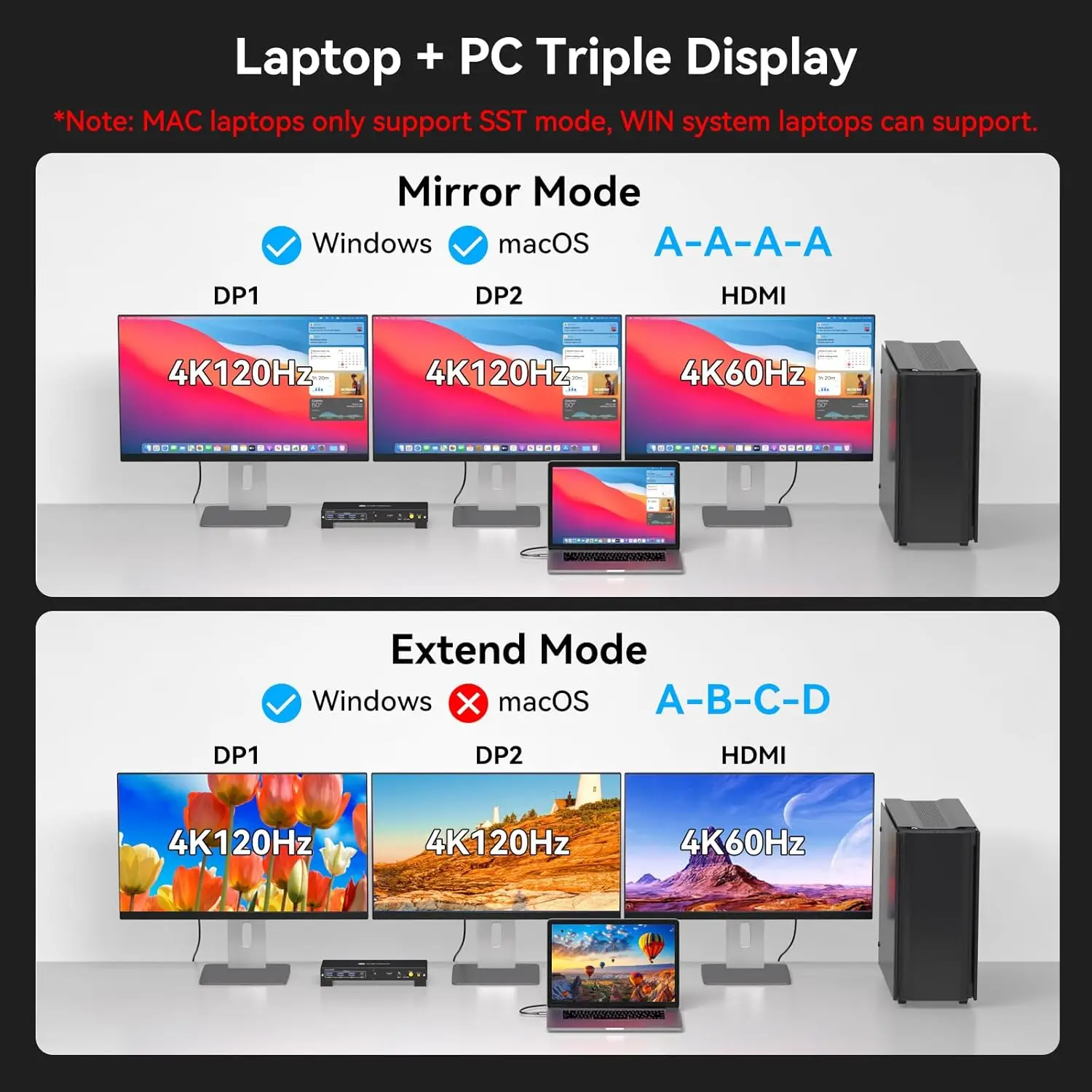 【USB C KVM 스위치 3 모니터 2 컴퓨터】kvm 스위치는 Thunderbolt 3 노트북 1대와 데스크탑 컴퓨터 1대 사이에 모니터 3개(DP 포트 모니터 2개와 HDMI 포트 모니터 1개)를 공유하는 데 사용되며 키보드, 마우스, 프린터, 이더넷 네트워크 포트와 같은 여러 외부 장치도 공유합니다.미러 모드와 확장 모드의 두 가지 디스플레이 모드를 지원합니다.Mac OS는 미러링 모드만 지원하며 세 가지 다른 화면을 확장할 수 없습니다. 참고: 노트북의 USB C 포트가 Thunderbolt 3 이상인지, 모든 컴퓨터에 트리플 디스플레이를 지원하는 카드가 있는지 확인하세요.