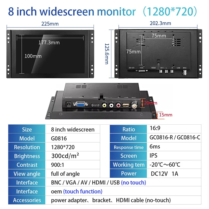 8 인치 16:9 금속 LCD 터치 모니터의 사양 |